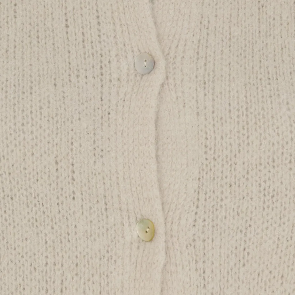 Beige strikket cardigan fra Marta Du Chateau med rund halsudskæring og 3/4 ærmer. Den bløde strik har en behagelig blanding af naturlige og syntetiske fibre.