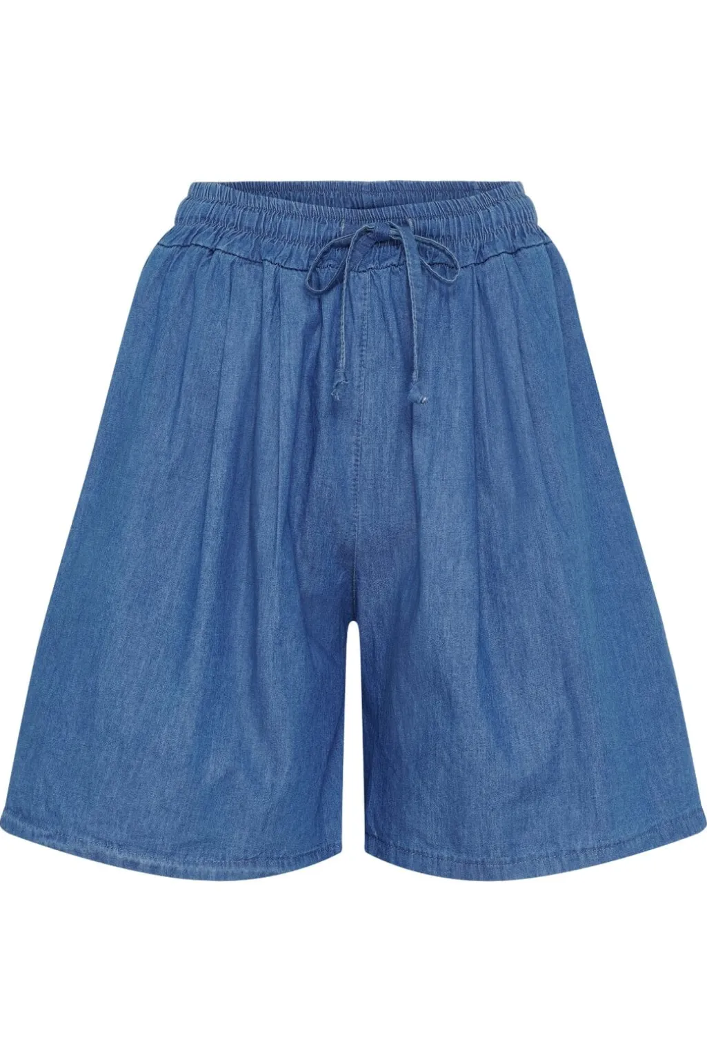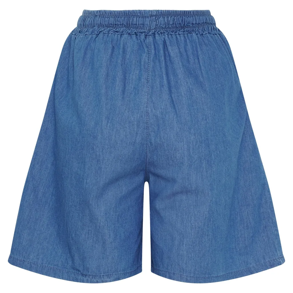 Blå shorts fra Marta Du Chateau i lårlængde med regular taljehøjde. Shortsene har en afslappet pasform med flæsedetaljer og bindelukning i taljen.