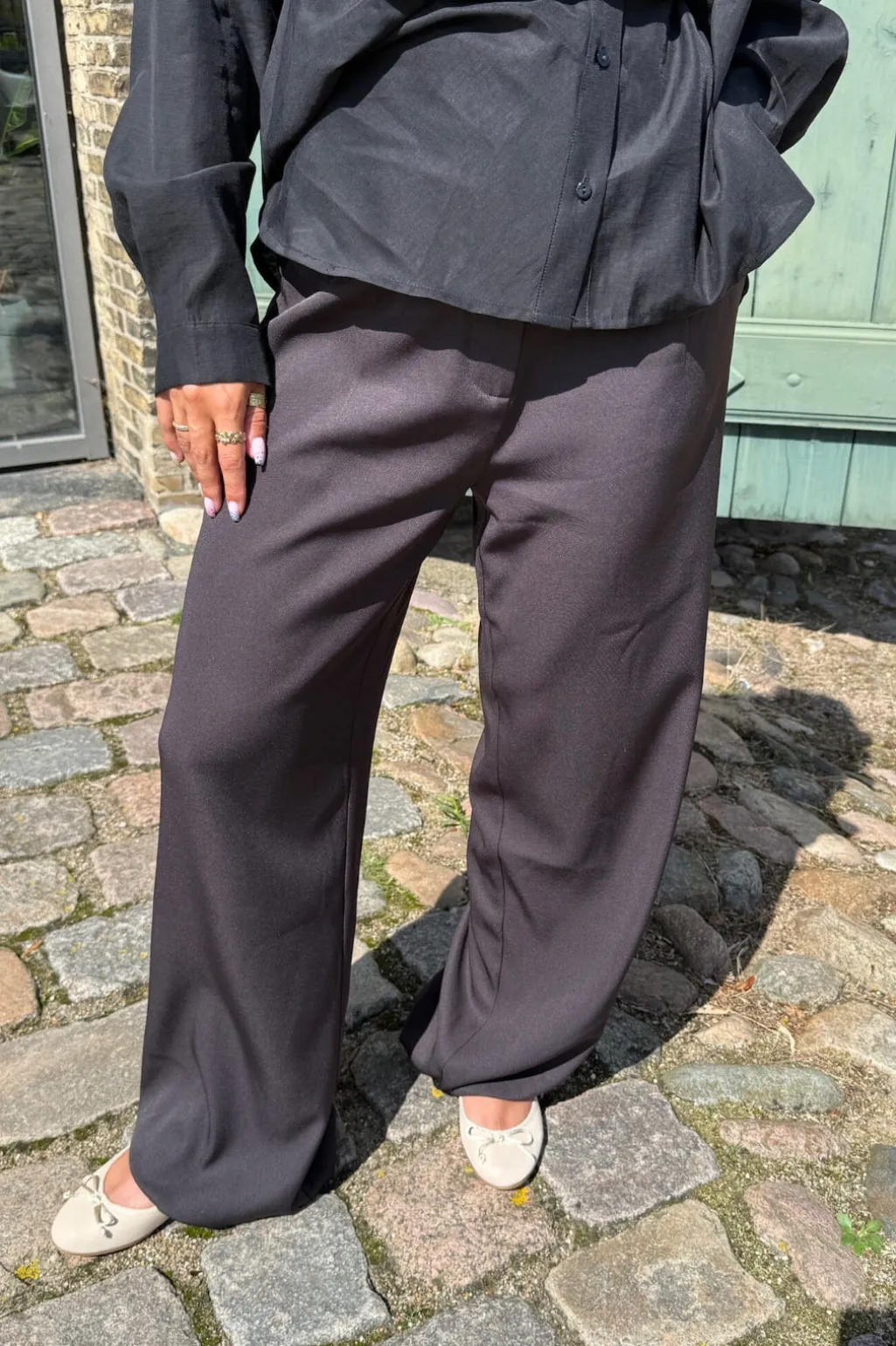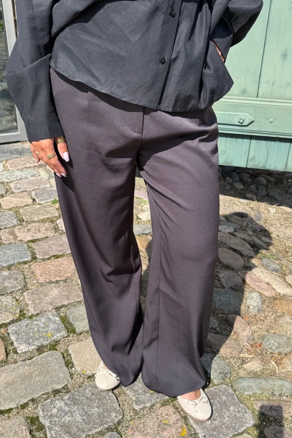 Sorte bukser fra Dear Molly med en løs pasform og gulvlang længde. Bukserne har almindelig taljehøjde og lukkes med lynlås og knapper.