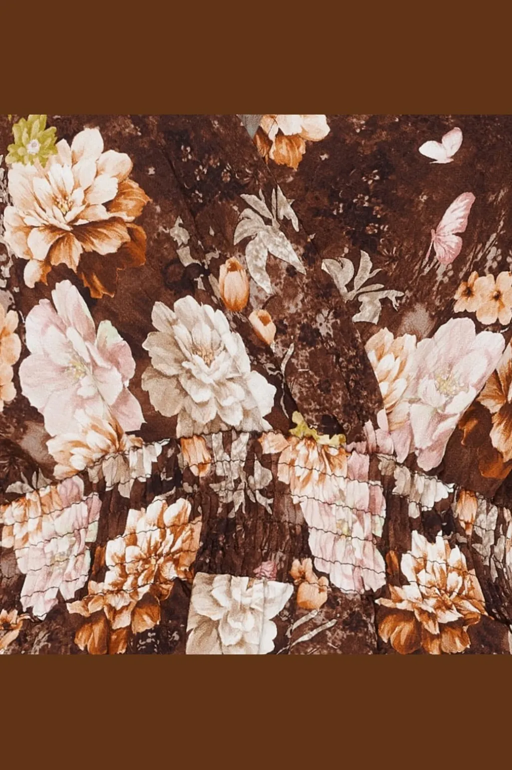 Brun kjole fra Marta Du Chateau med blomstermønster. Kjolen har V-hals, pufærmer og smock i taljen. Den går til midt på læggen og har dekorative syninger og flæser.