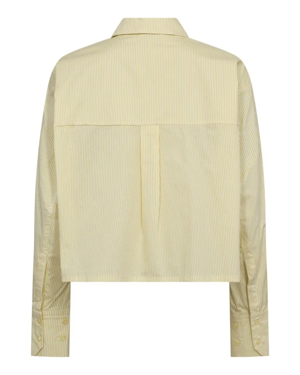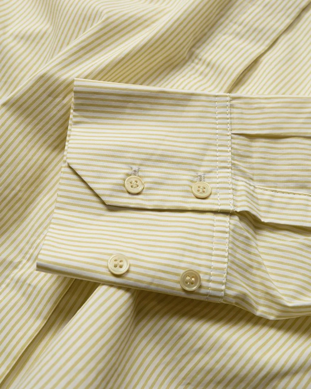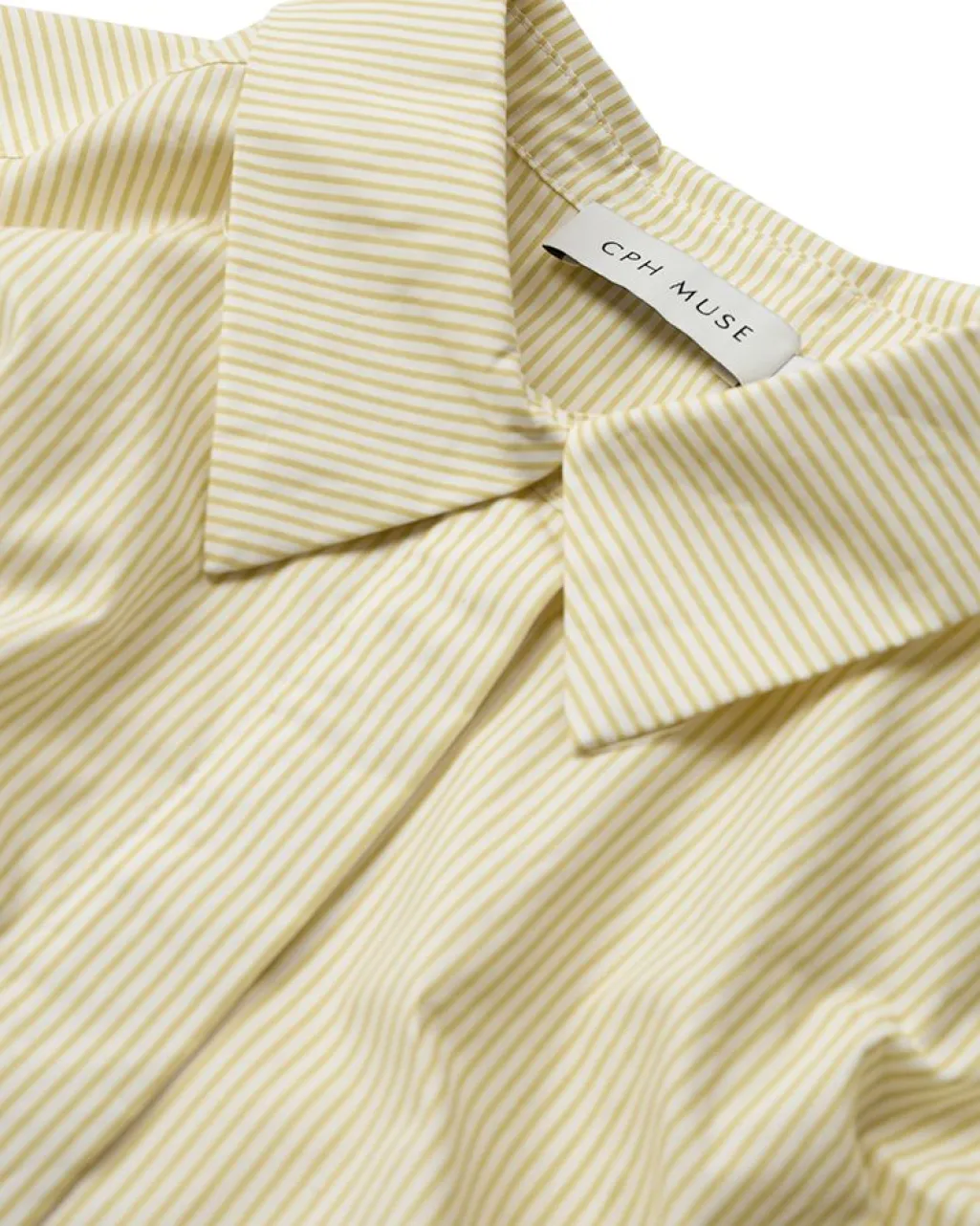 Stribet skjorte fra Copenhagen Muse, lavet af 100 % økologisk bomuld. Skjorten er gul- og hvidstribet med klassisk krave og knaplukning.