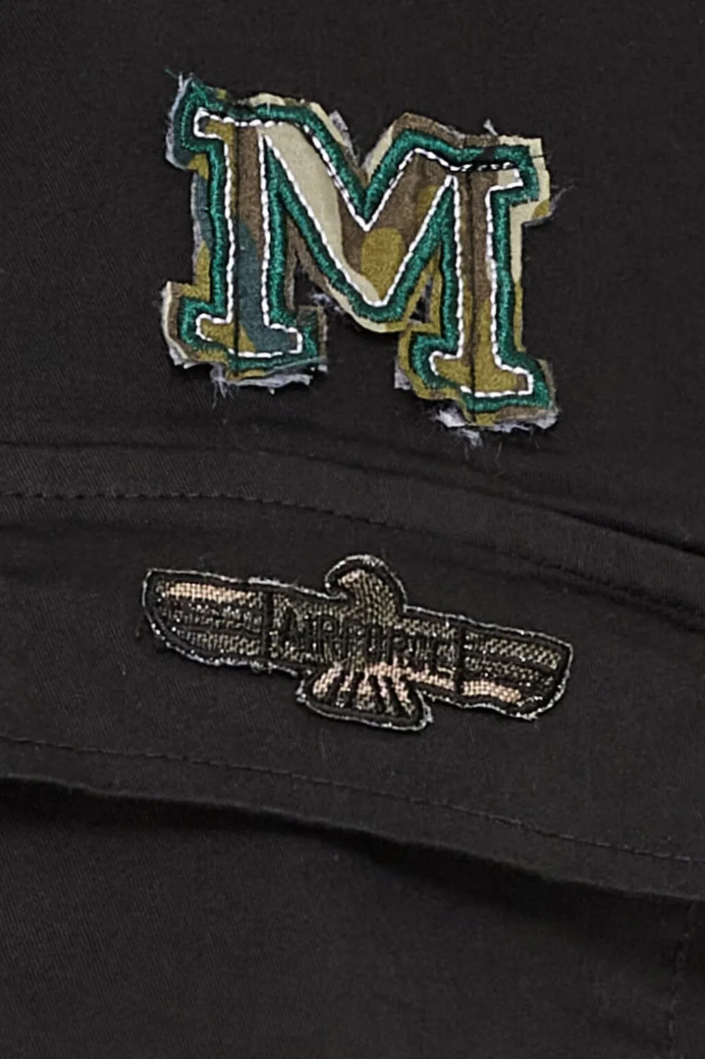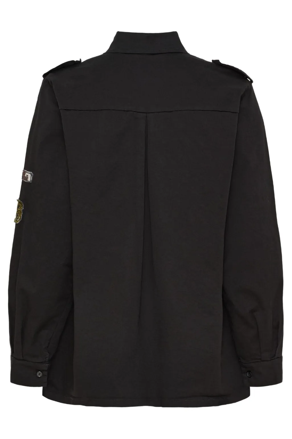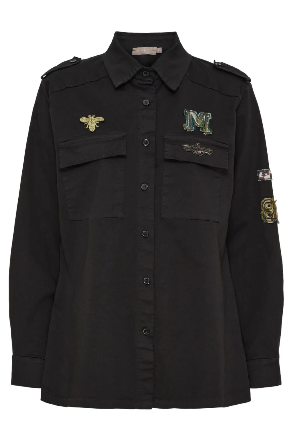 Sort jakke fra Marta Du Chateau med skjortekrave og knapper. Den har broderede patches med bi og M-logo samt dekorative skulderlapper, der giver et militærinspireret udtryk.
