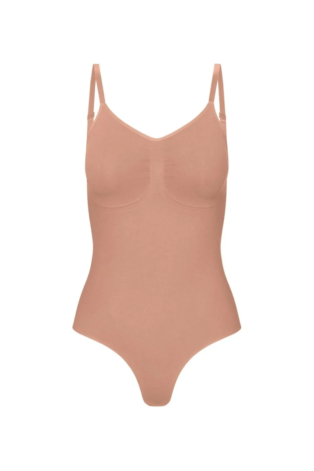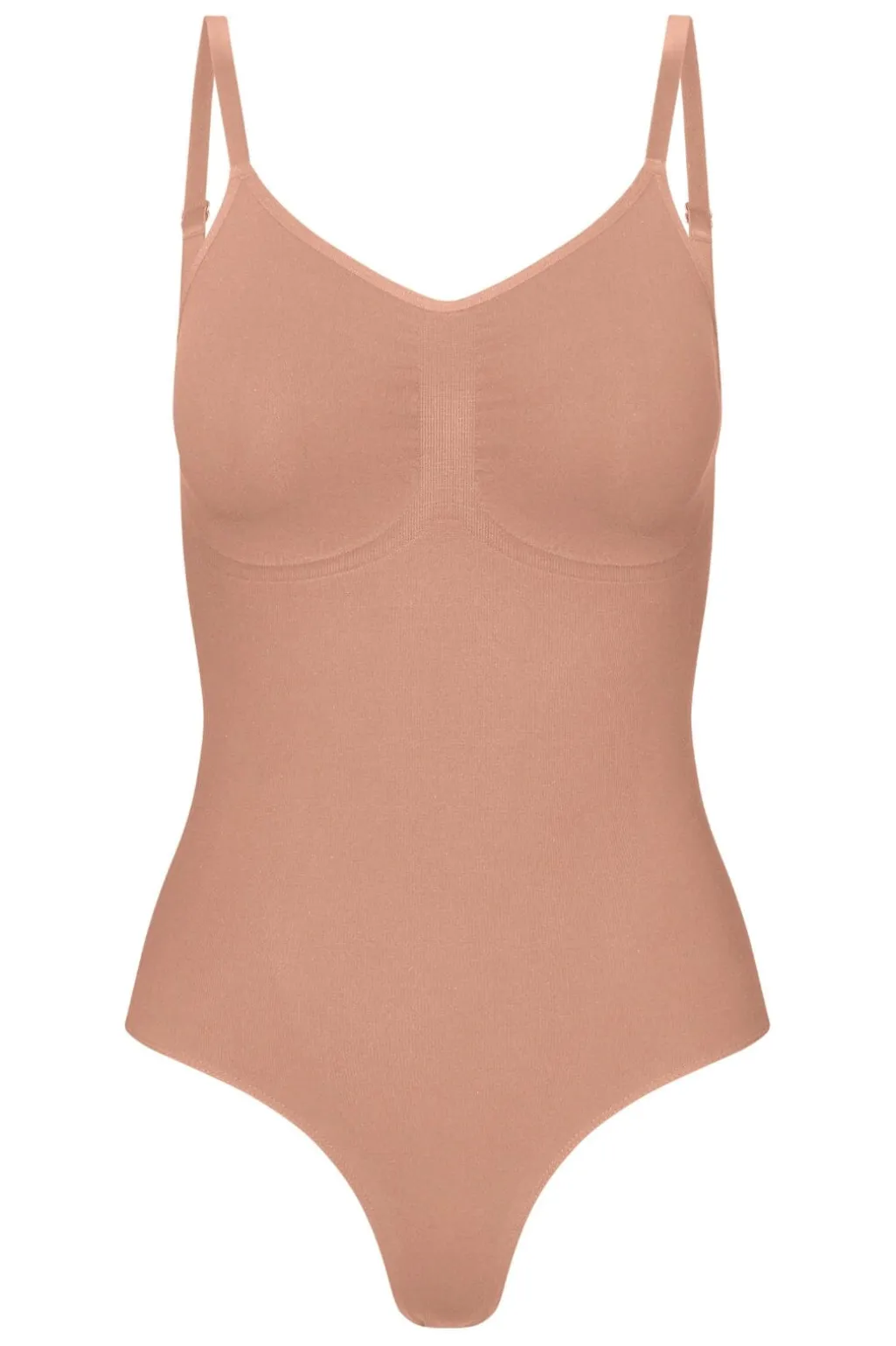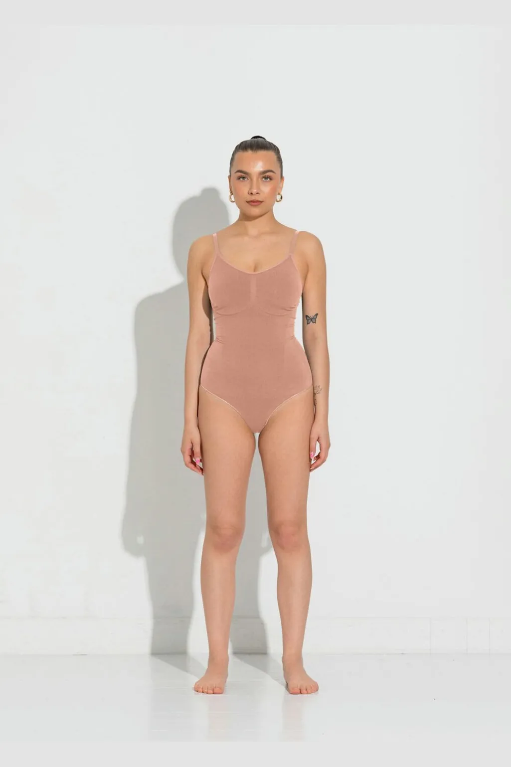 Shapewear bodysuit fra Lykkeland Ateliér i tan-farve. En tætsiddende bodysuit med formgivende effekt, der skaber en glat silhuet under tøjet.