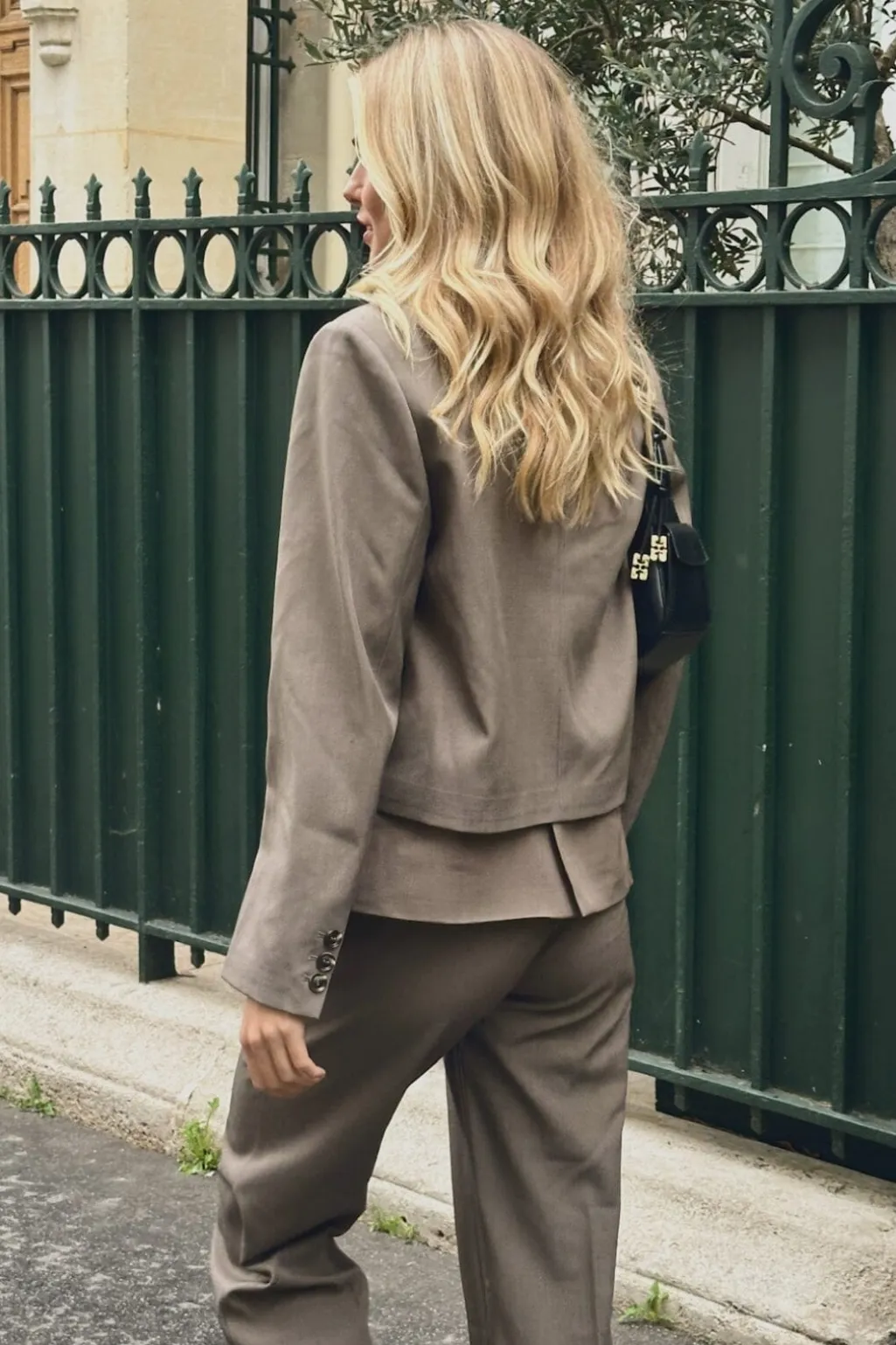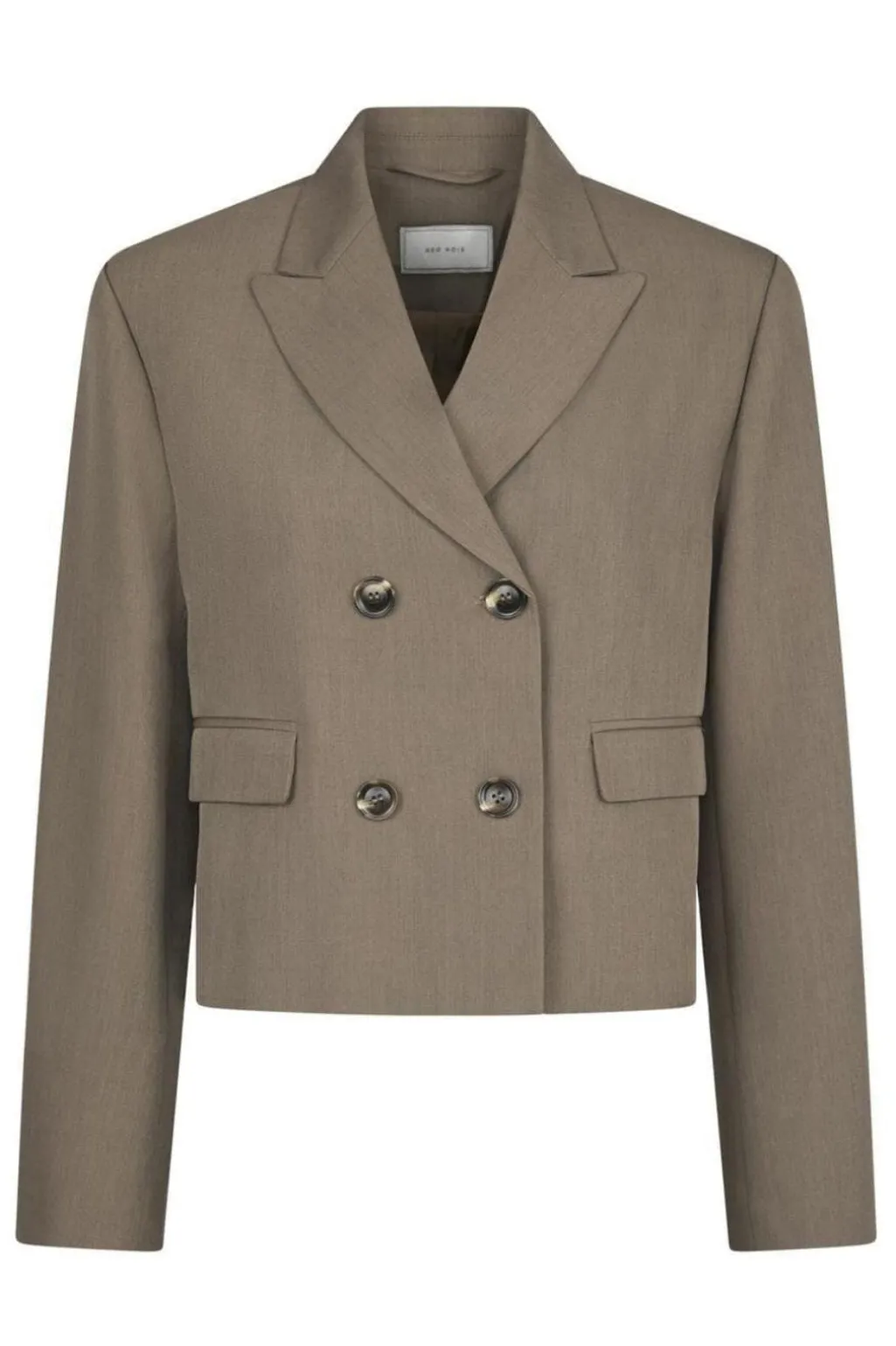 Khakifarvet blazer fra Neo Noir med dobbeltradet knaplukning. En struktureret blazer med V-udskæring og lange ærmer, der kan styles til både hverdag og fest.