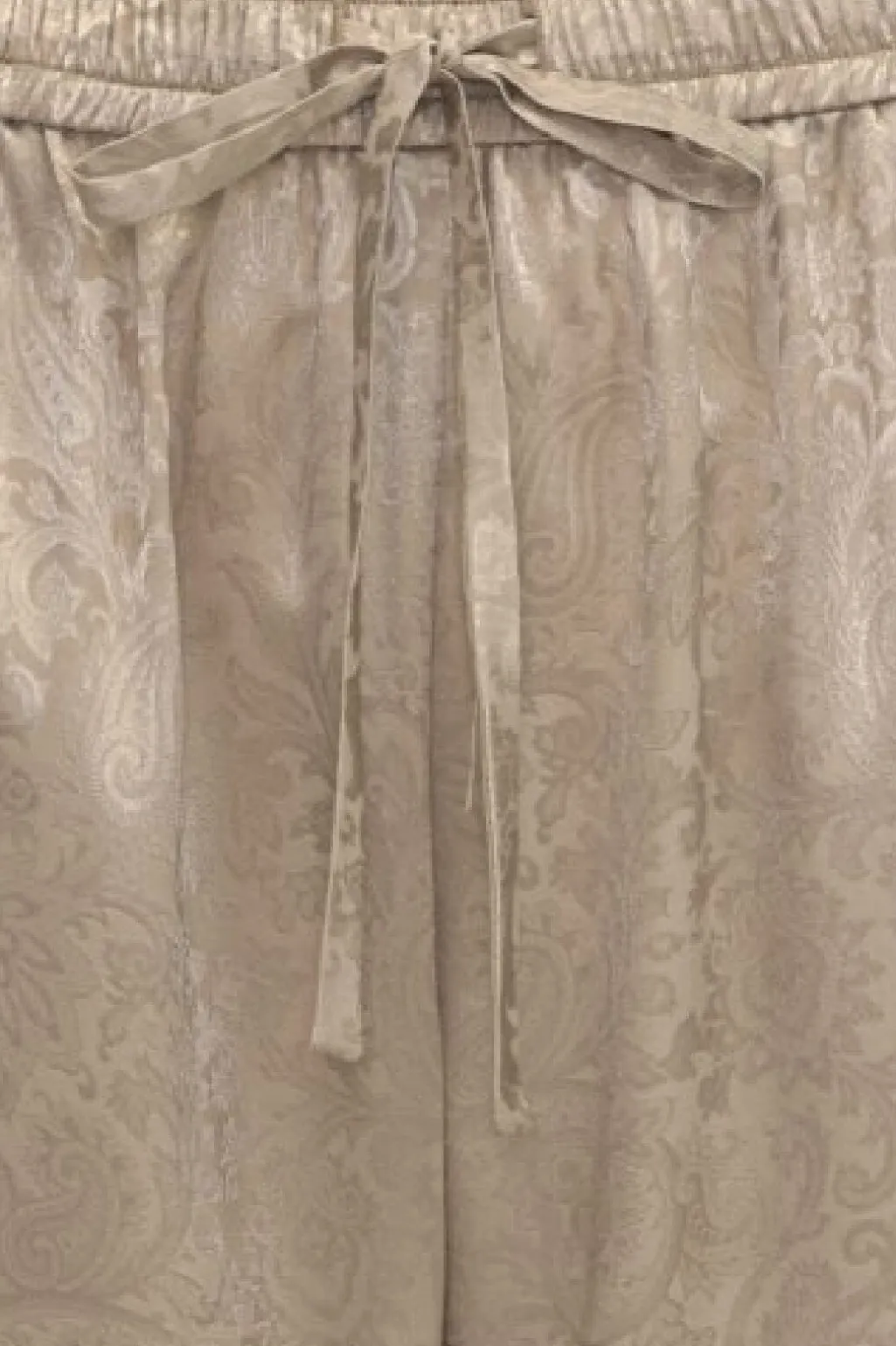 Beige bukser fra Karmamia med paisley-mønster i jacquard. Bukserne har sidelommer, bindebånd i taljen samt elastik ved taljen og anklerne.