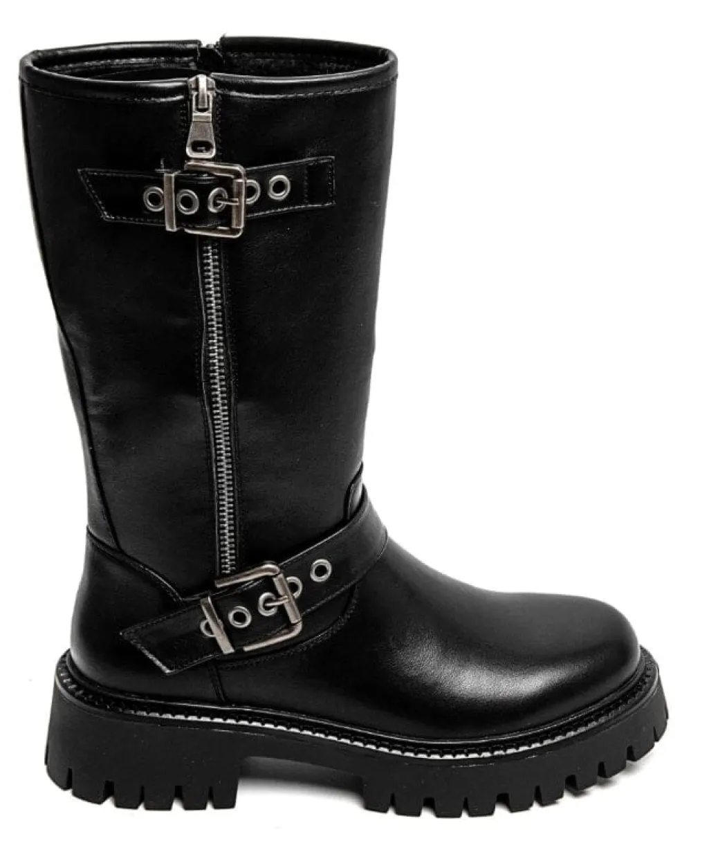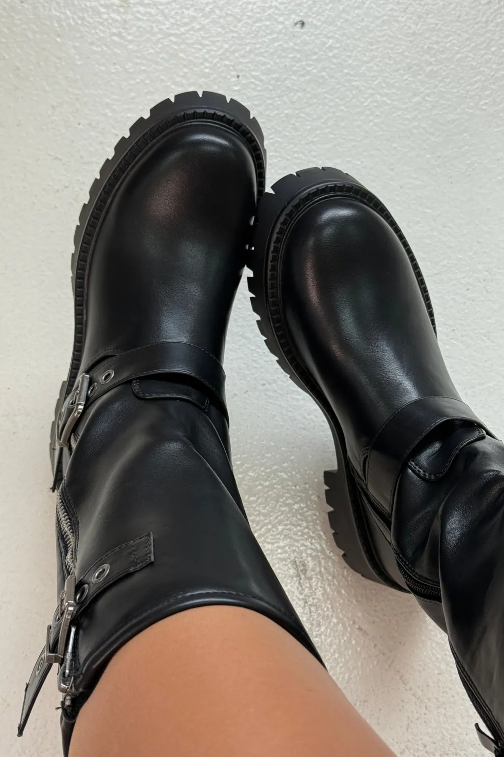 Sorte støvler fra Bloom, lavet af syntetisk materiale. Støvlerne har en kraftig sål, lynlås på siden og remme med spænder.