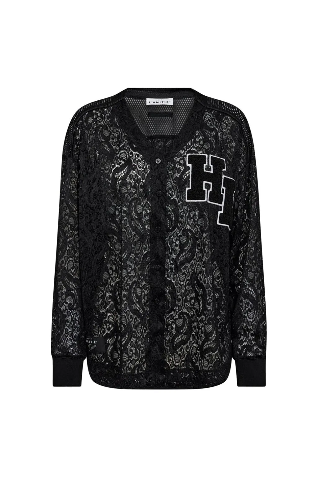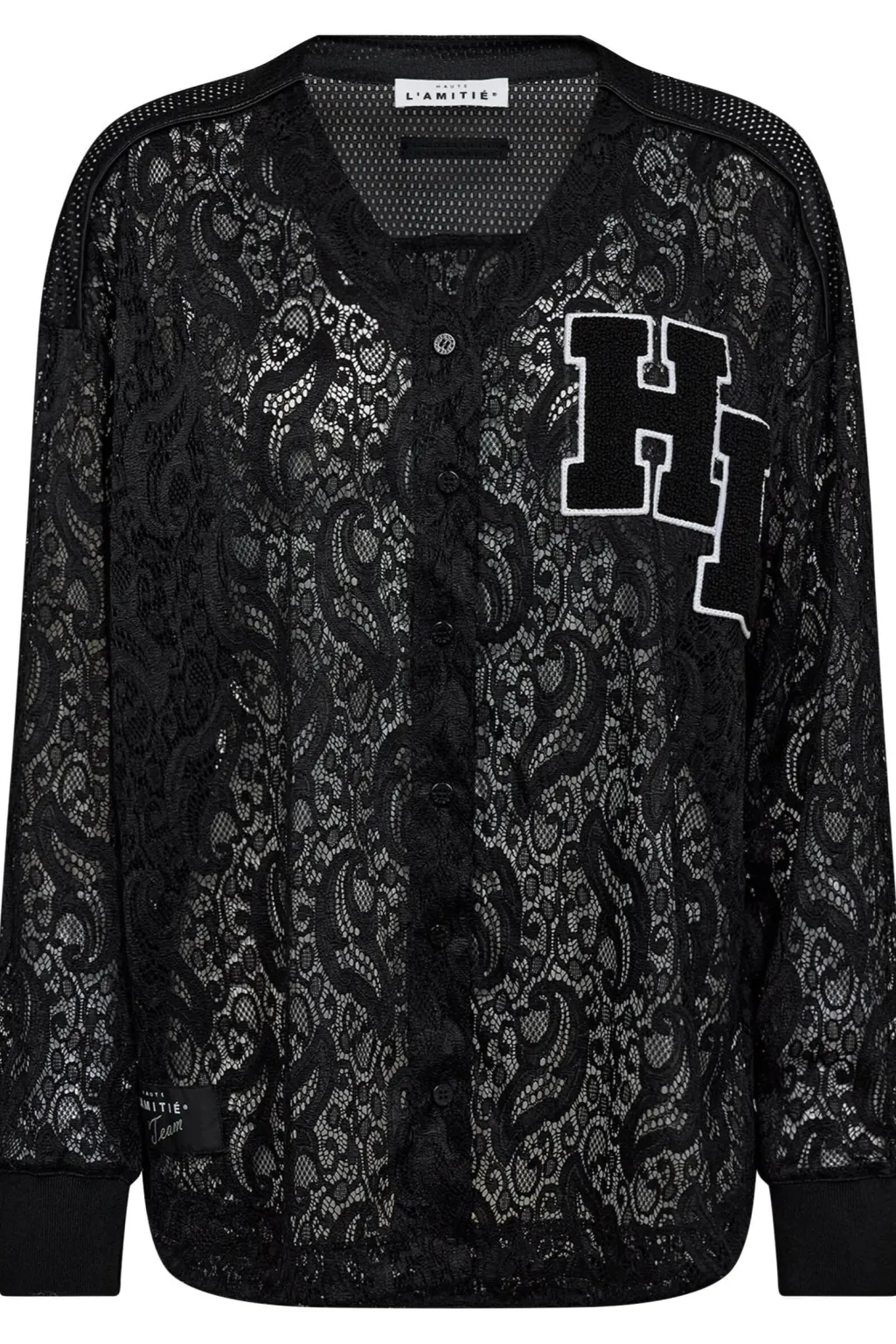 Sort blondebluse fra Haute L’Amitié med et detaljeret blondemønster og stort HL-logo på forsiden. Blusen har lange ærmer og en gennemgående knaplukning.