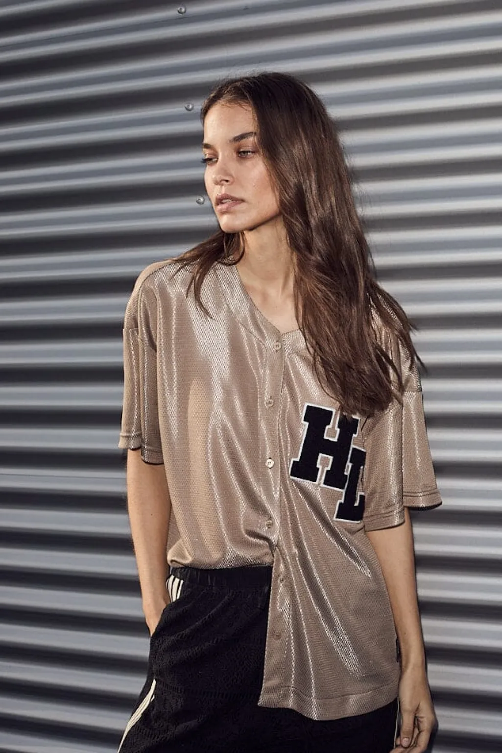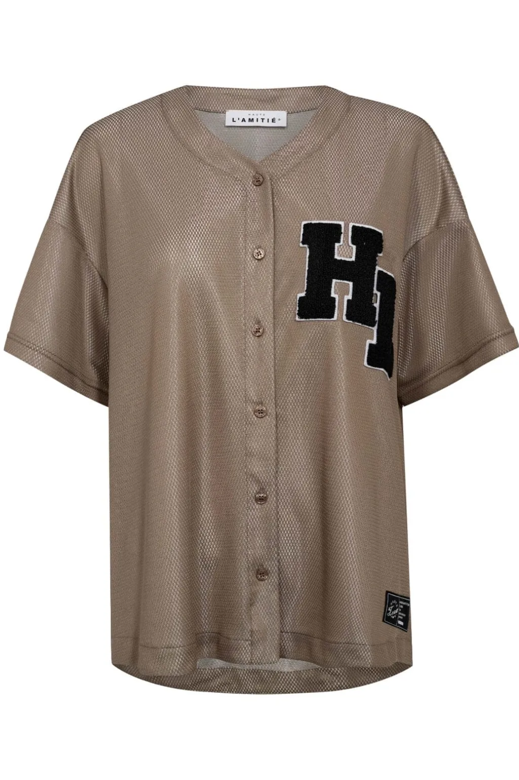 Brun mesh-t-shirt fra Haute L’Amitié med V-hals og knaplukning. Materialet har en åben struktur med et stort HL-logo på brystet.