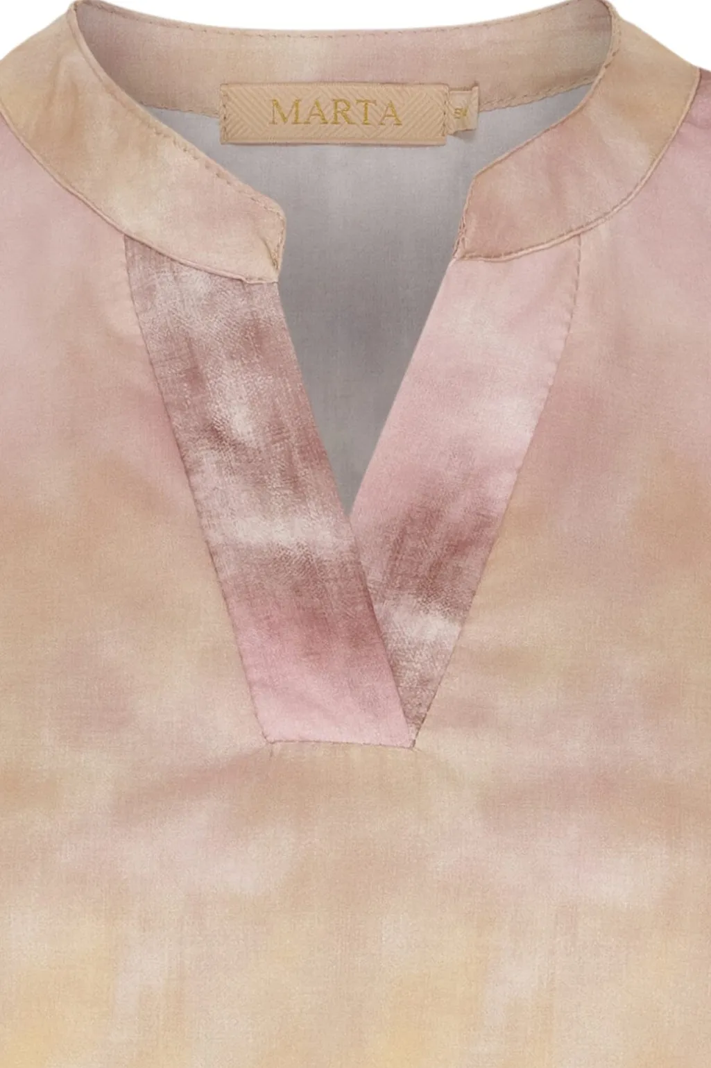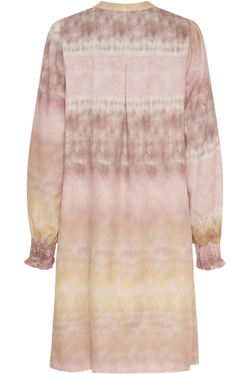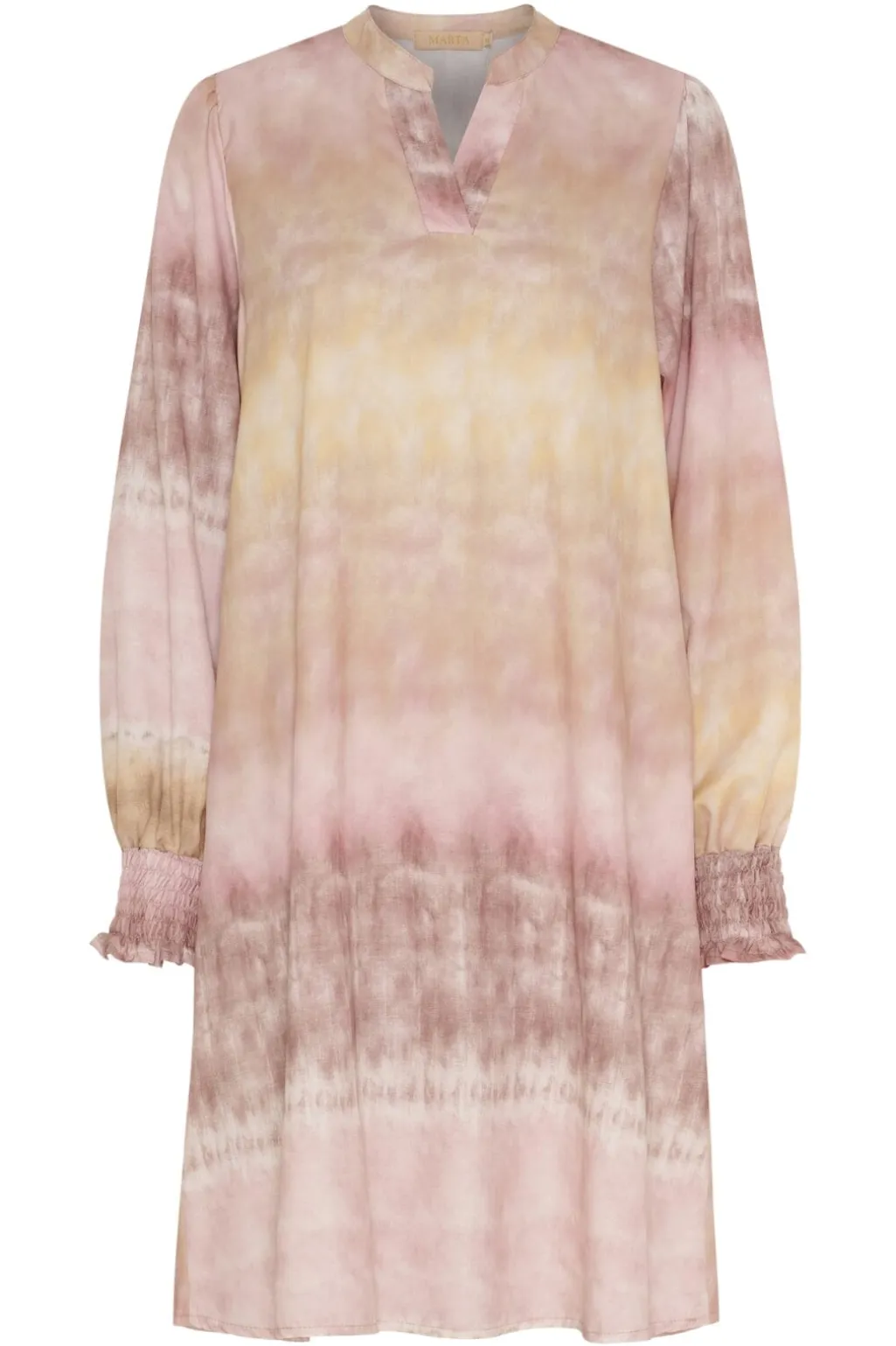 Rosa kjole fra Marta Du Chateau med tie-dye mønster i nuancer af pink og gul. Kjolen har V-udskæring og lange ærmer med samlede manchetter.