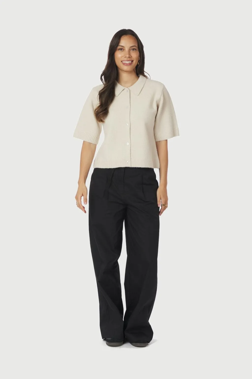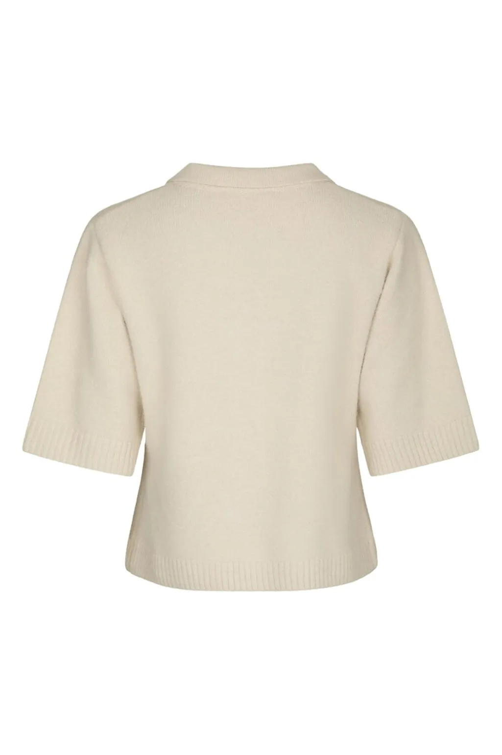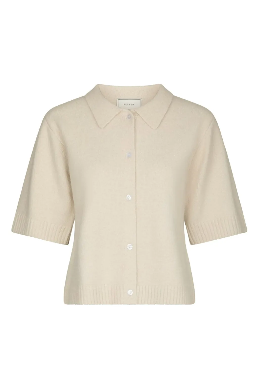 Strikbluse fra Neo Noir i elfenben. Blusen har en polokrave og korte ærmer med ribkant. Knapperne foran giver blusen et klassisk udtryk.
