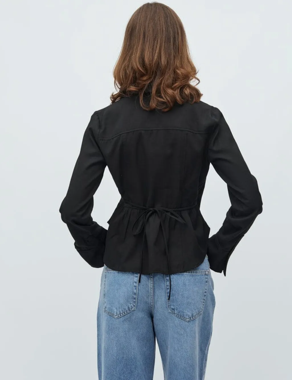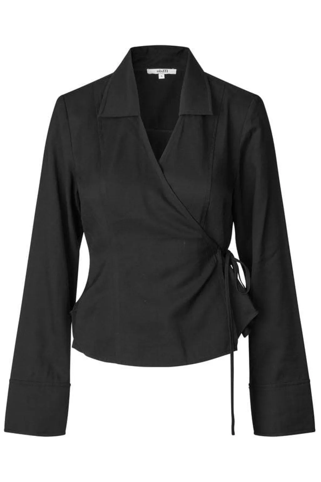 Sort wrap-skjorte fra MbyM med bindebånd i siden, flæsedetaljer og skjortekrave. Skjorten har lange ærmer med brede manchetter og en normal pasform.