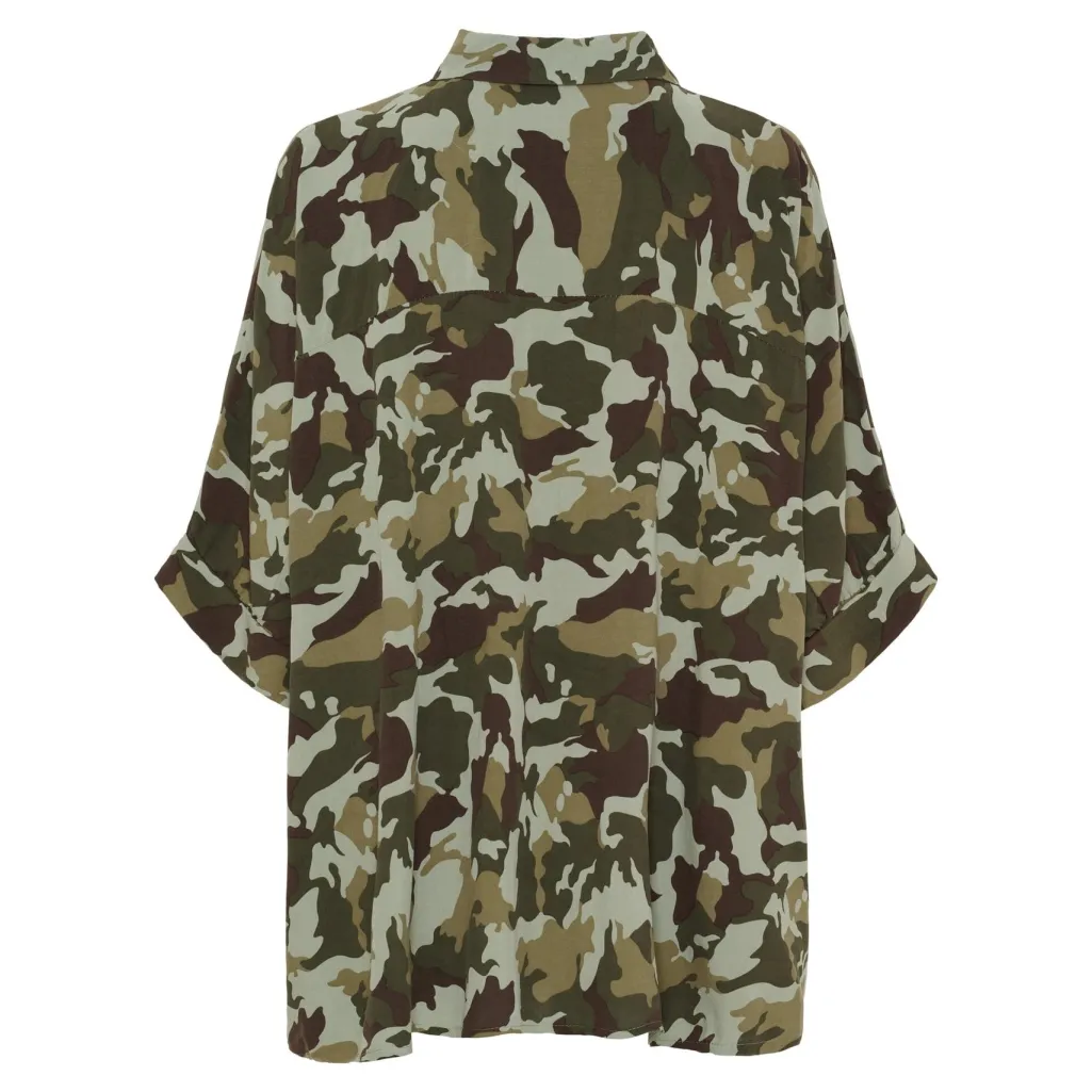 En skjorte fra Marta Du Chateau med camouflage-mønster i khaki grøn og grøn. Skjorten er lavet af 100 % viskose og har en oversized pasform.
