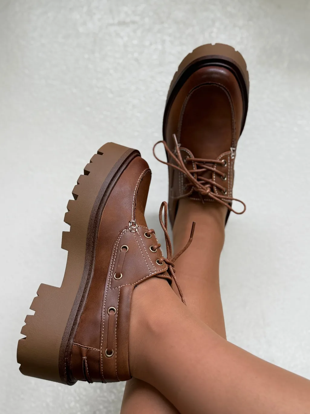 Loafers fra Bloom i en lysebrun camel-nuance. Skoen har snørebånd, blokhæl og en rund tå.
