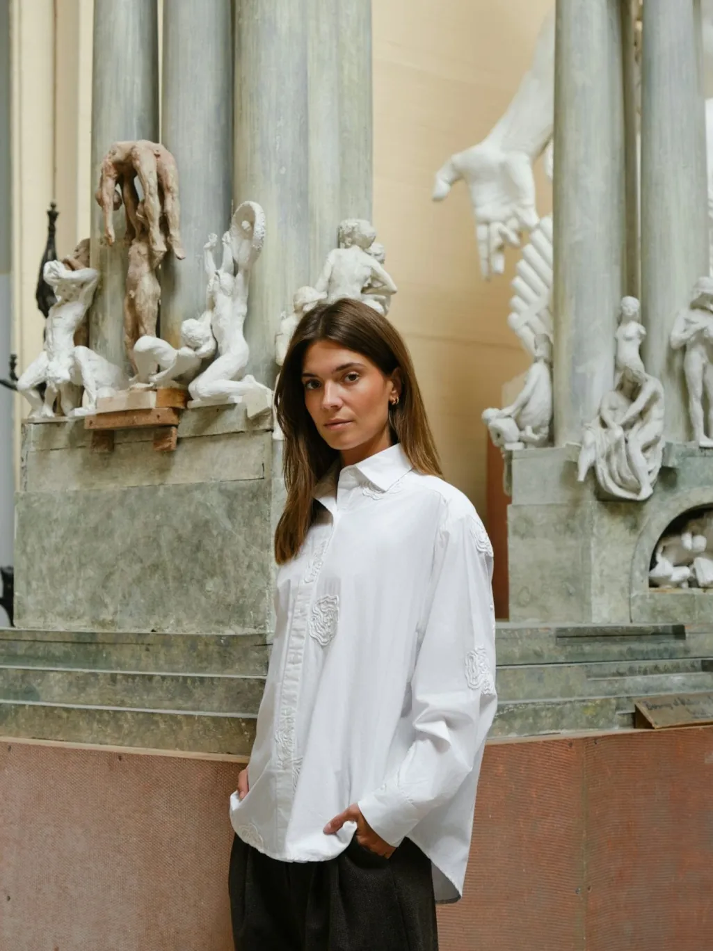 - Modellen er 176 cm høj og bærer størrelse 36