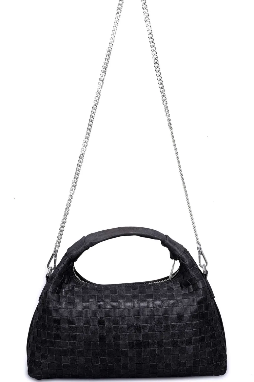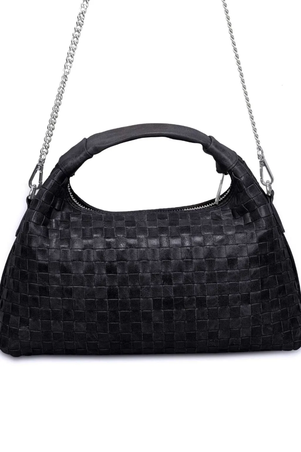 Sort håndtaske fra Núnoo med et karakteristisk flettet design. Tasken har en kædestrop til skulderen og en praktisk lynlåslukning i toppen.