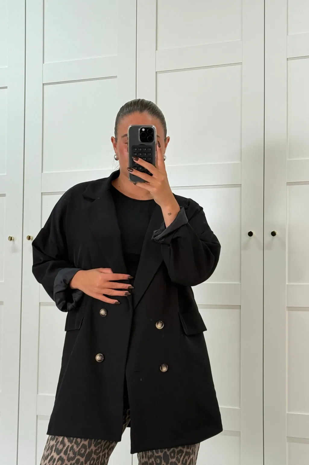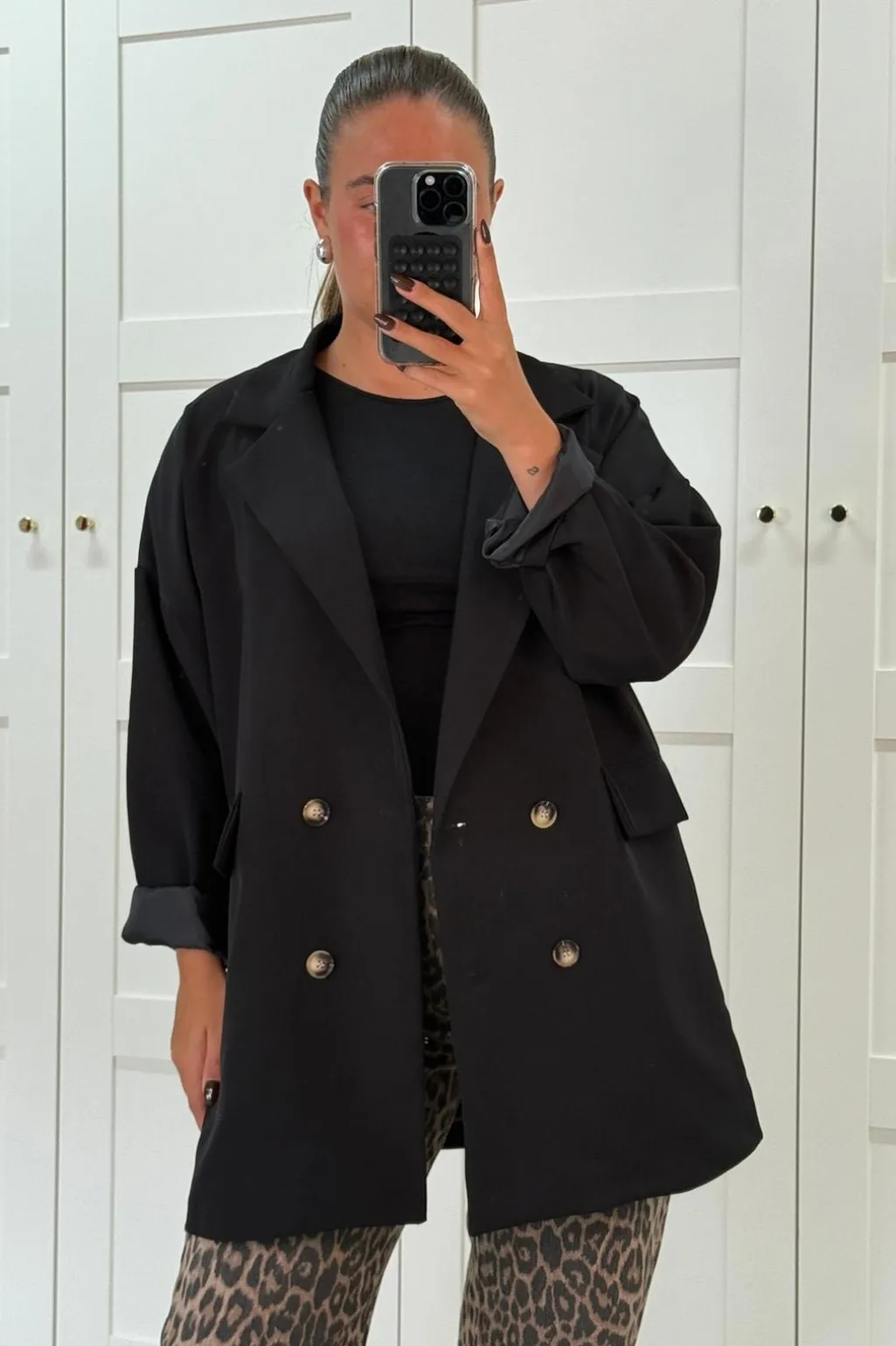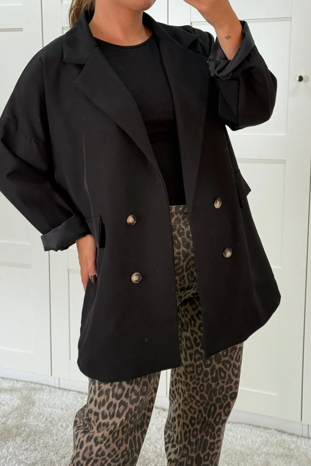 Sort blazer fra A-bee med dobbeltradet knaplukning. Blazeren har en løs pasform med opsmøgede ærmer og lommer på begge sider.