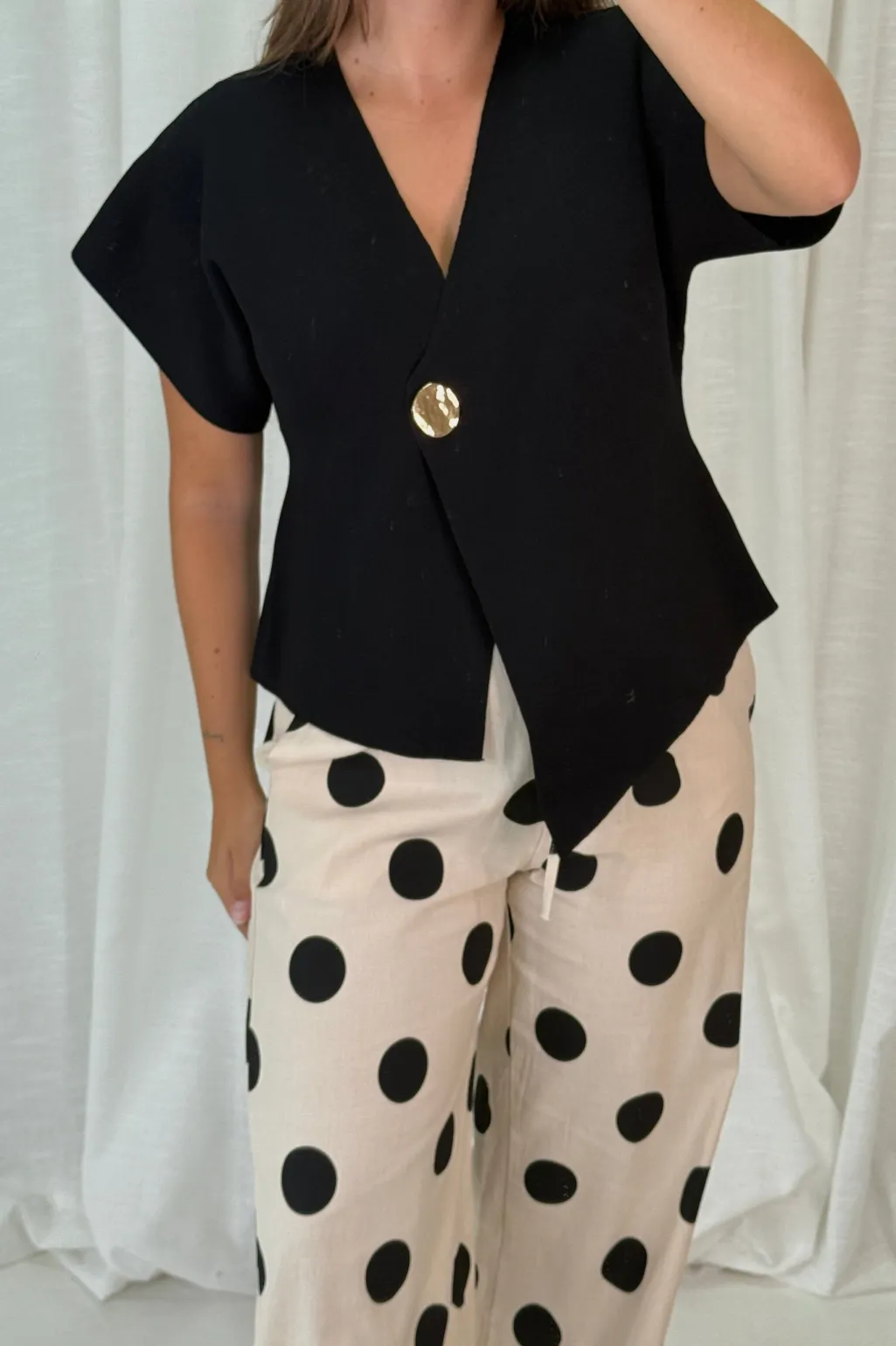 Sort top fra A-bee med asymmetrisk design, stor dekorativ knap og korte, brede ærmer. Toppen har en V-udskæring og er lavet af viskose og polyamid.