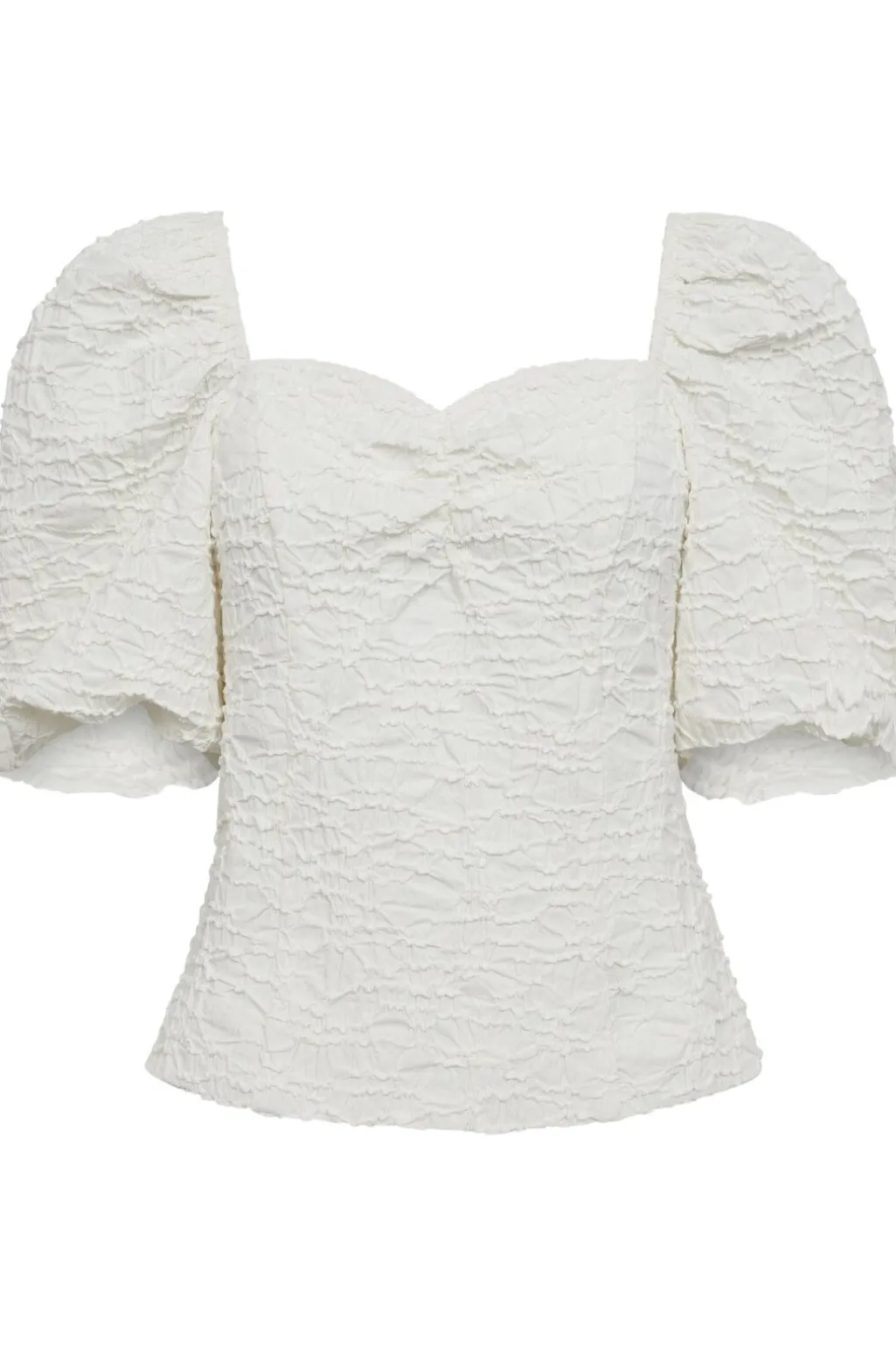 Hvid top fra Haute L’Amitié med krøllet tekstur og pufærmer. Den firkantede halsudskæring fremhæver skuldrene og giver toppen et struktureret udtryk.