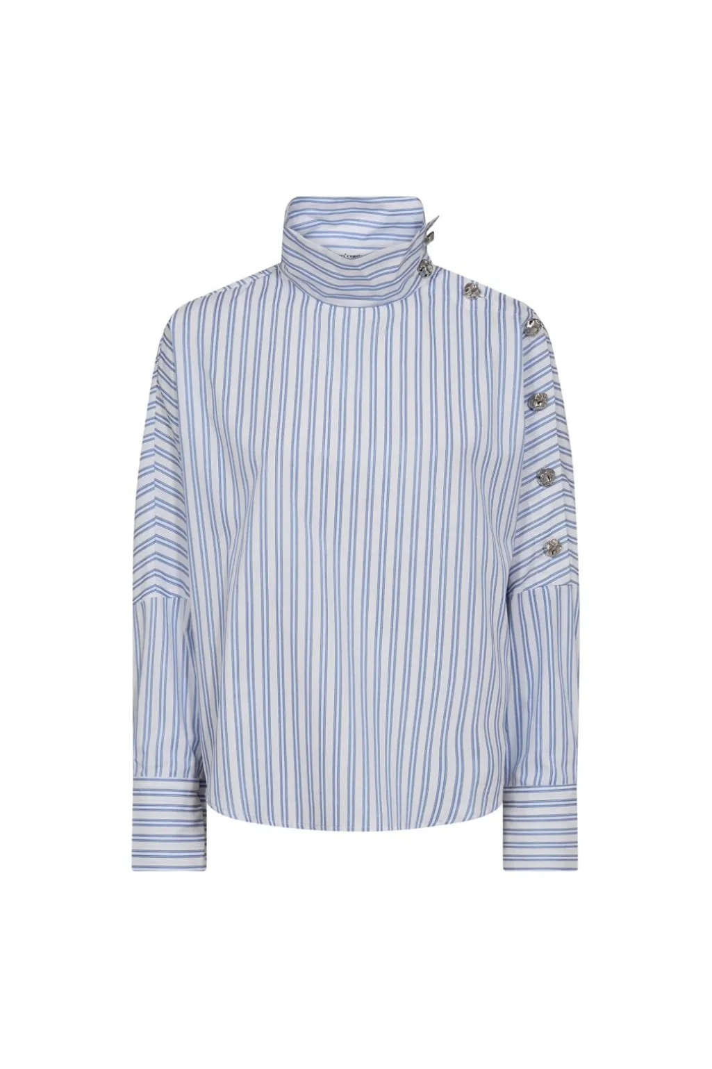 Stribet bluse fra Co´Couture i lyseblå, blå og hvid med en asymmetrisk knapdetalje langs venstre skulder.