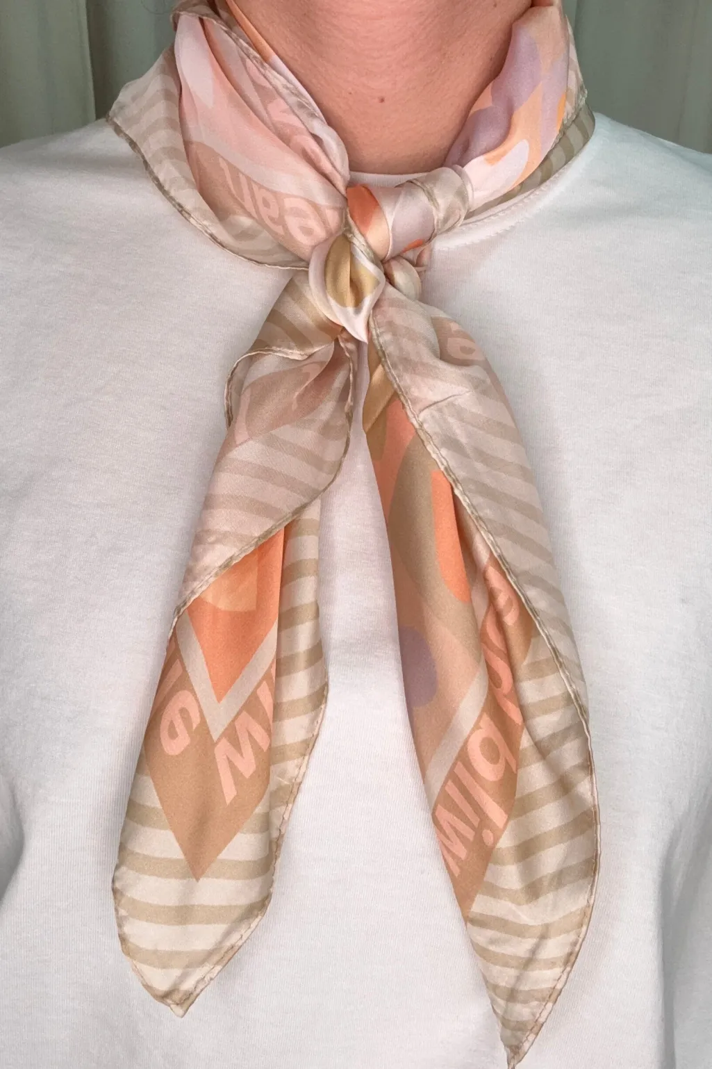 Beige tørklæde fra A-bee med striber og hjertemønster i fersken, lavendel og beige nuancer. Det bløde stof har en fin kombination af silke og polyester.
