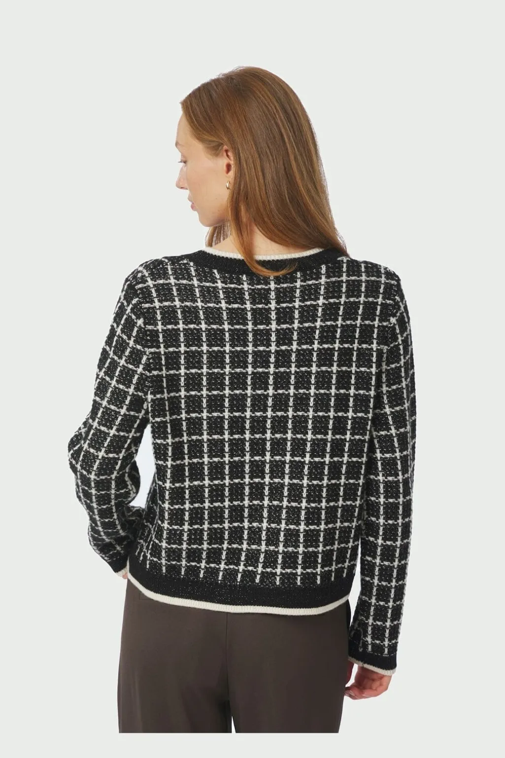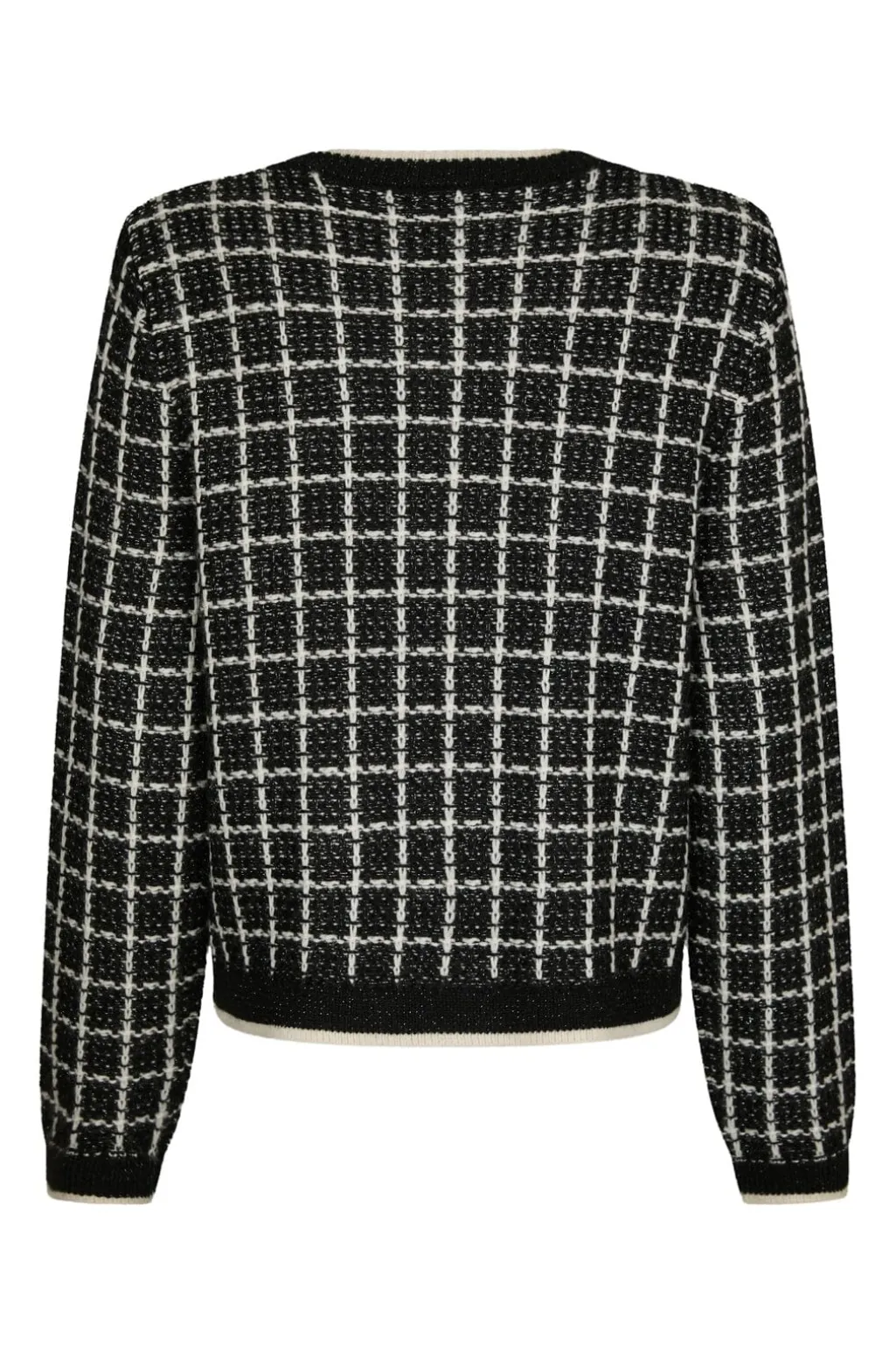 Sort strikket cardigan fra Neo Noir med hvidt ternet mønster. Cardiganen har rund halsudskæring, perleknapper og lommer foran.
