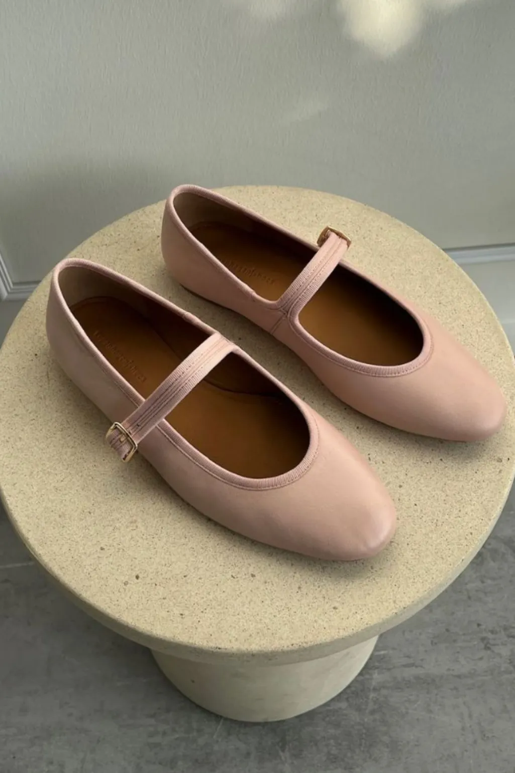 Ballerina fra Copenhagen Shoes i nude læder. En flad sko med spænde-lukning over vristen og firkantet tå. Skoen har en neutral farve, der nemt kan styles til forskellige outfits.