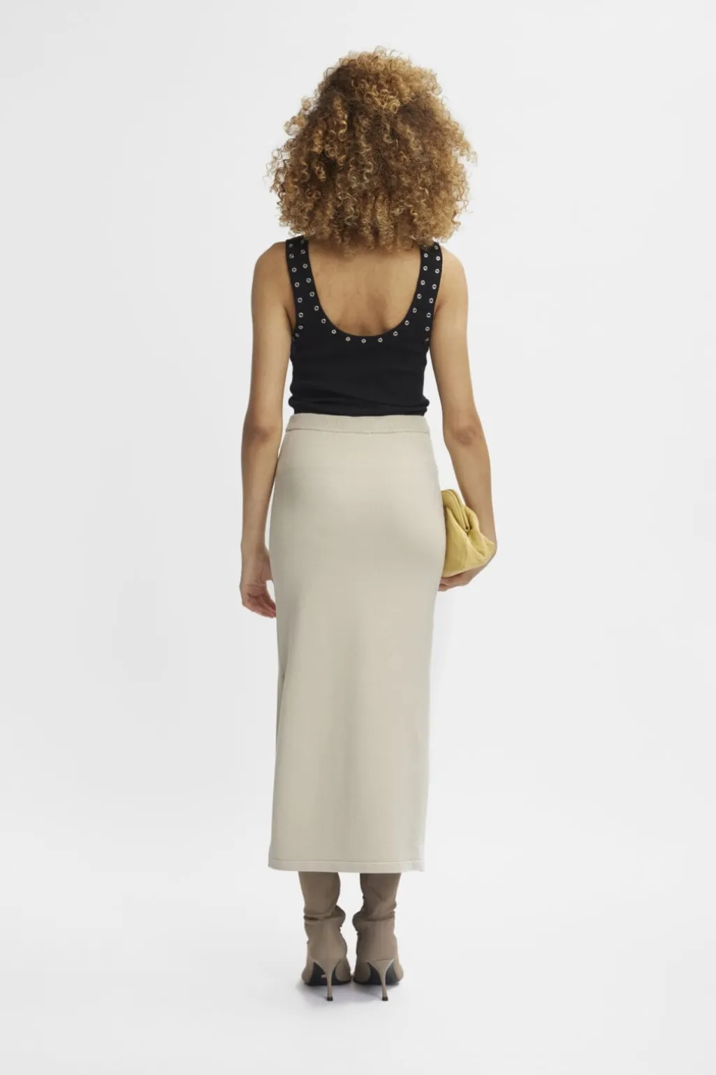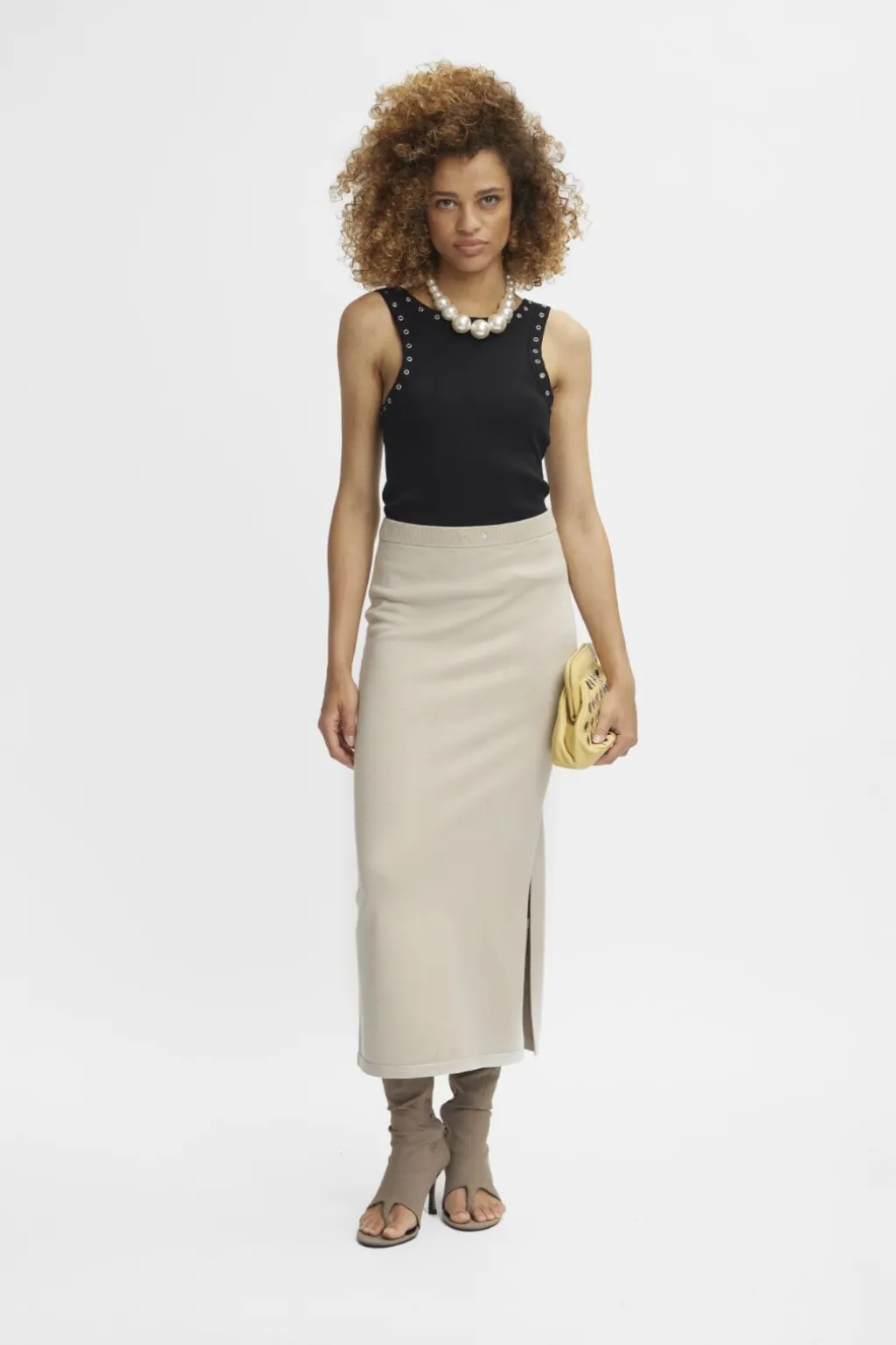 Sort tanktop fra Gestuz med eyelet-detaljer langs skulderen og halsudskæringen. Toppen har en rund hals og kan styles til både hverdag og fest.