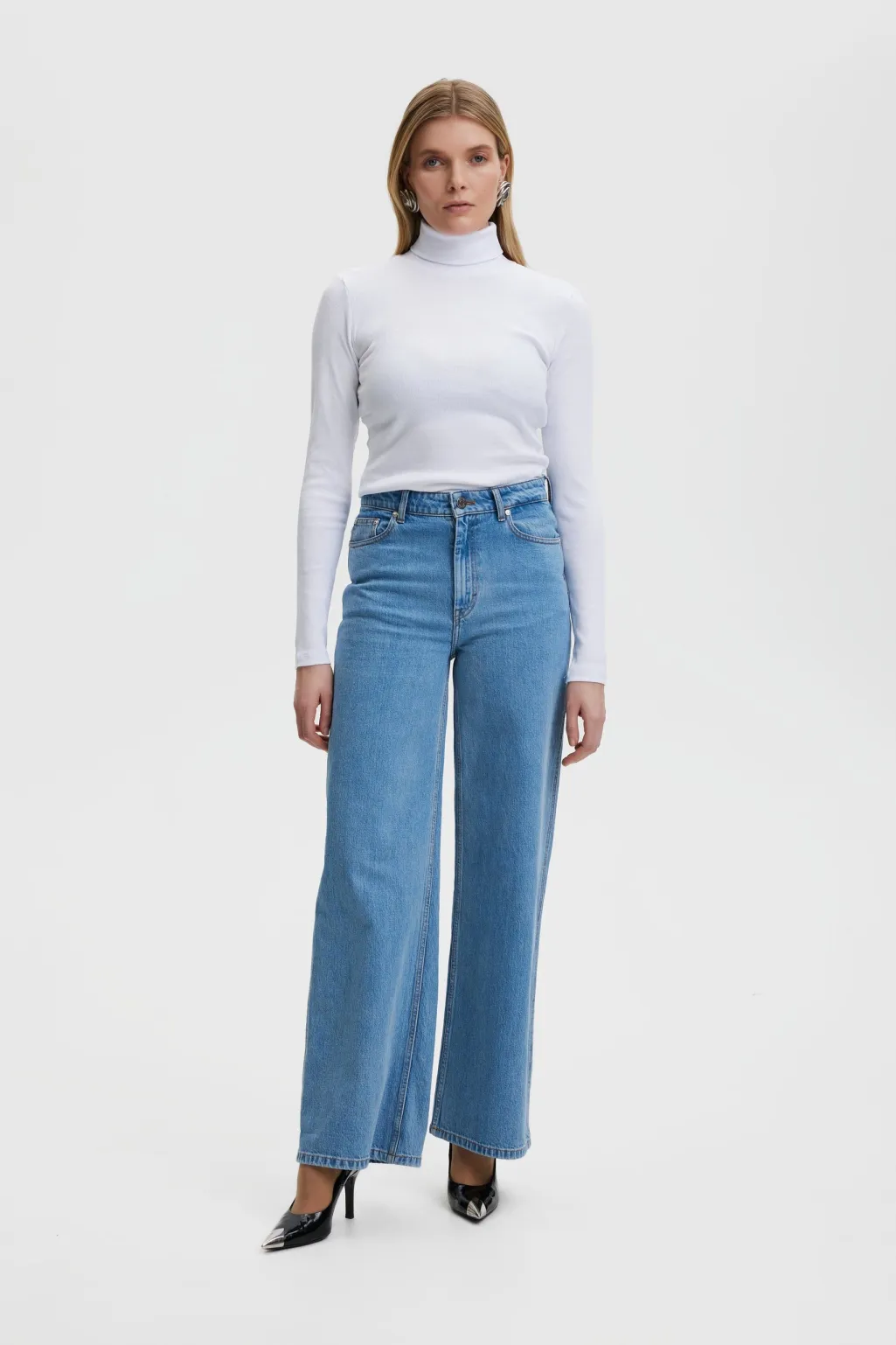 Hvid rullekrave fra Gestuz med ribbet stof og høj hals. Den tætsiddende top har lange ærmer og en enkel konstruktion uden lukning.