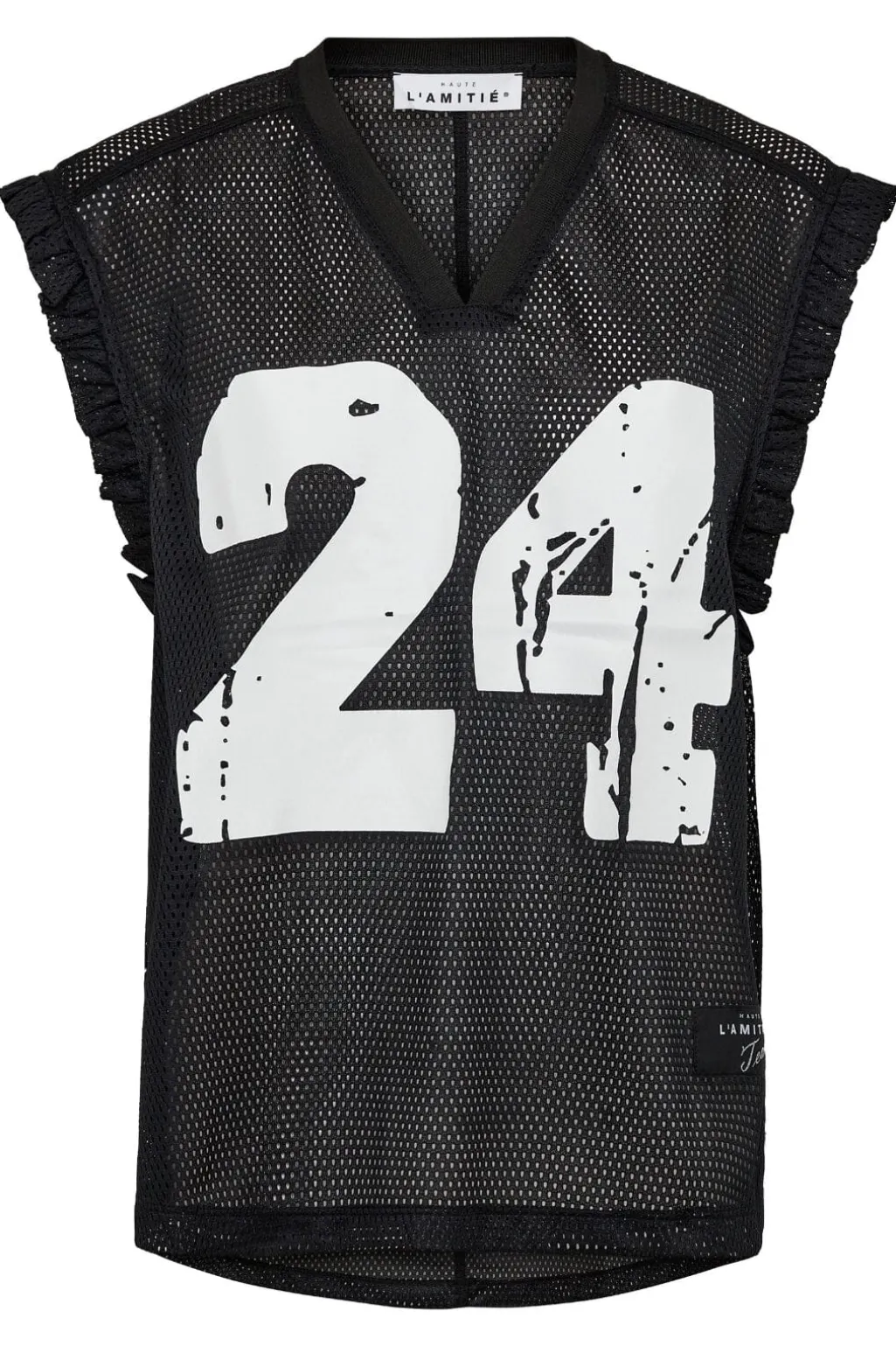 Sort top fra Haute L’Amitié med netstruktur og hvidt 24-print på fronten. Toppen har V-udskæring og flæsedetaljer på skuldrene.