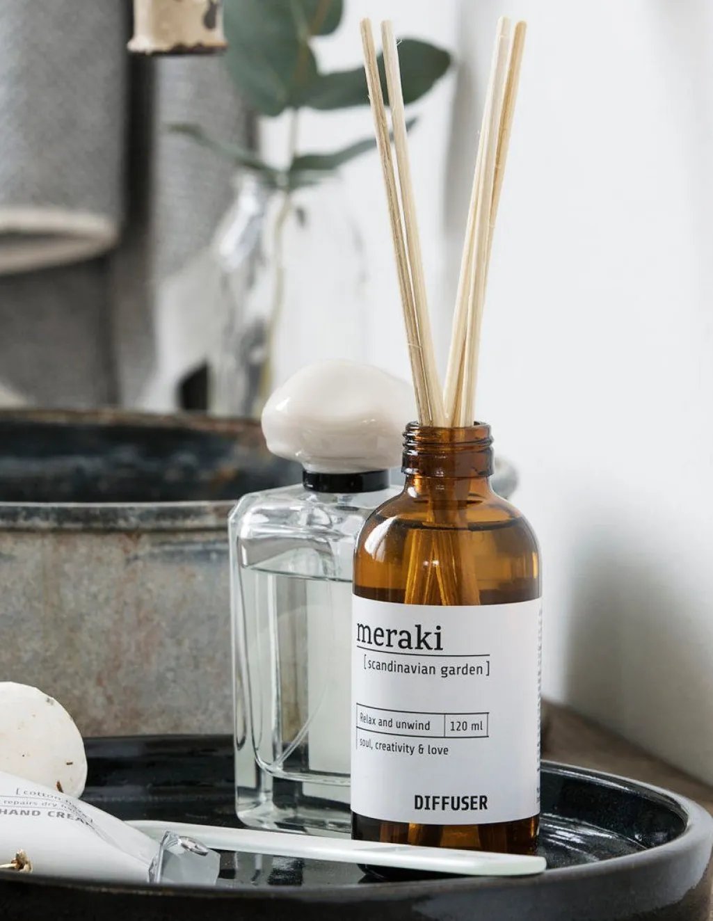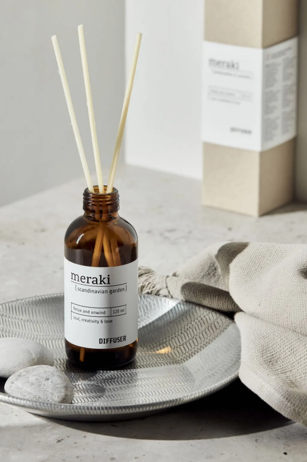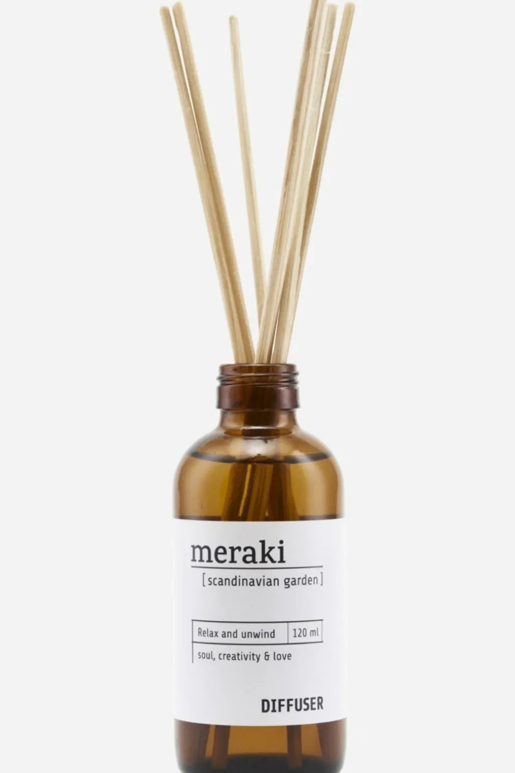 Duftfrisker m. 7 pinde fra Meraki. Giv et rum en mild og sanselig duft af Scandinavian Garden. Placer på dit badeværelse og få en dejlig spa agtig atmosfære, eller giv et rum en indbydende atmosfære.