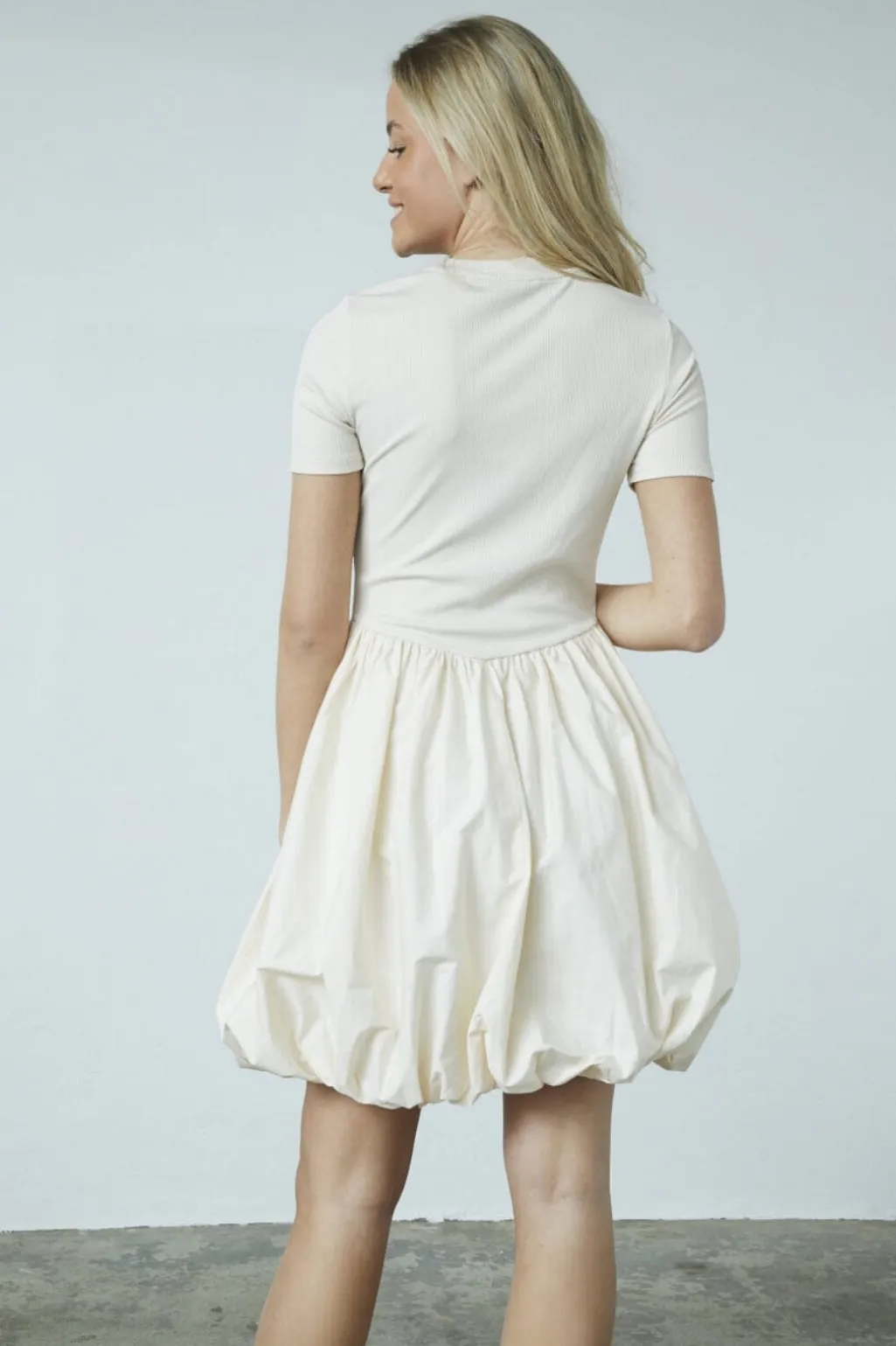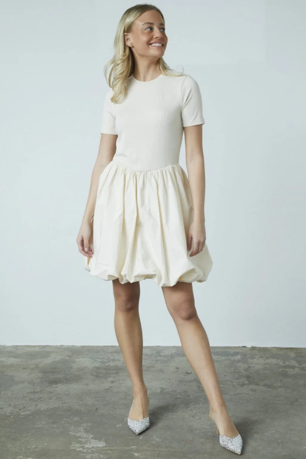 Kjole fra Sisters Point i en lys porcelænsfarve. Den har en ribbet overdel med rund hals og korte ærmer samt en nederdel med balloon-effekt og rynket søm ved hofterne.