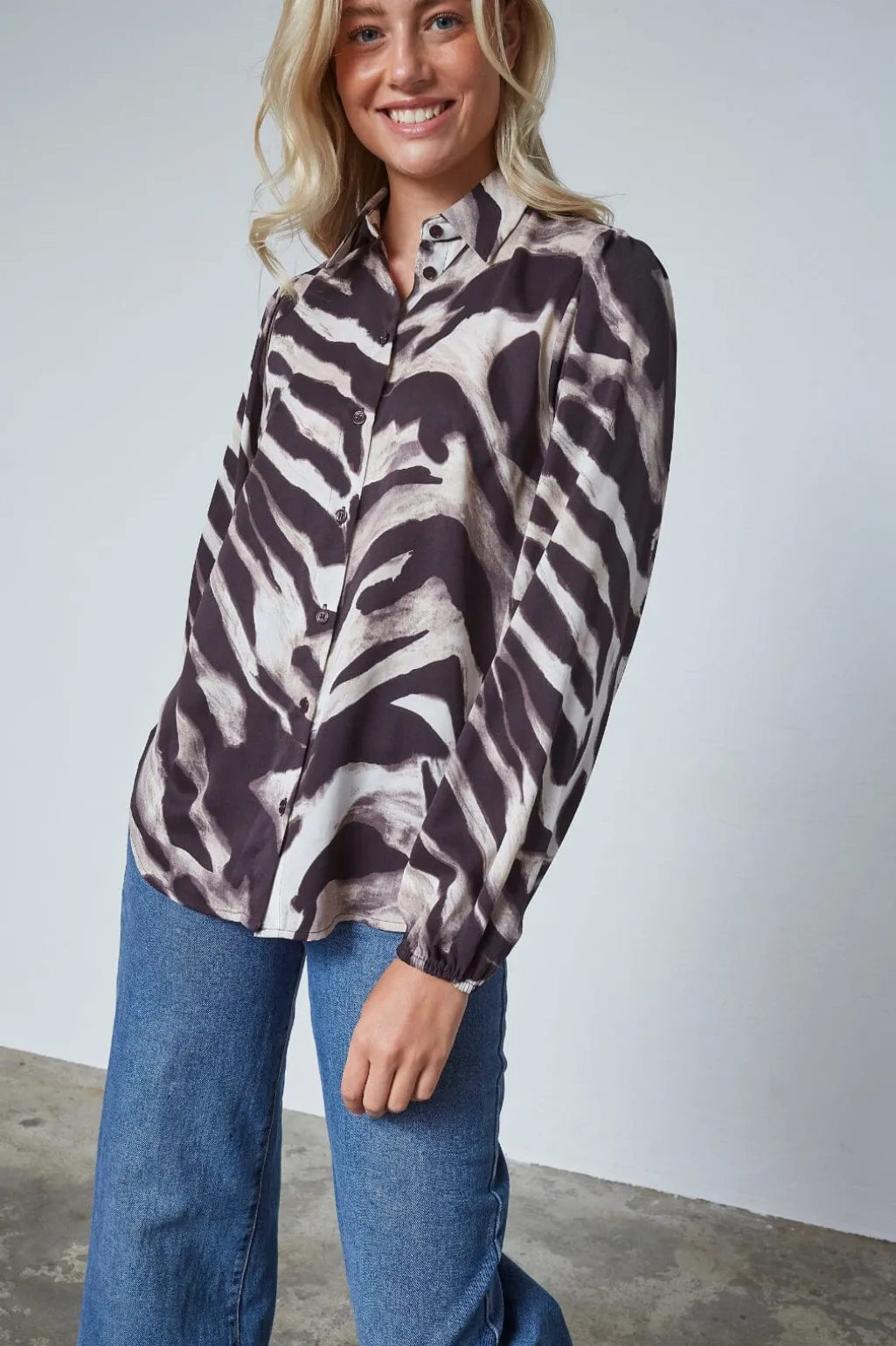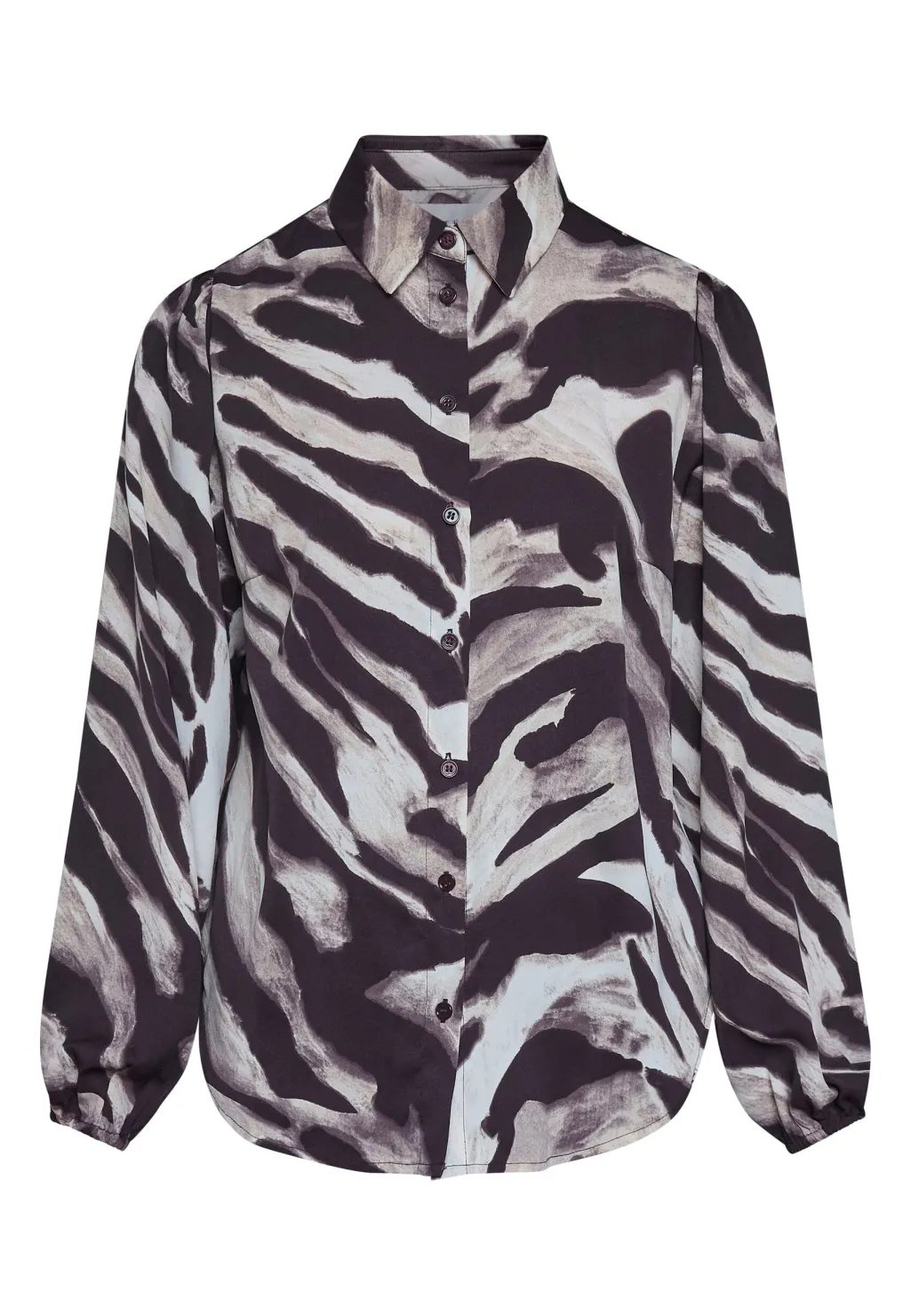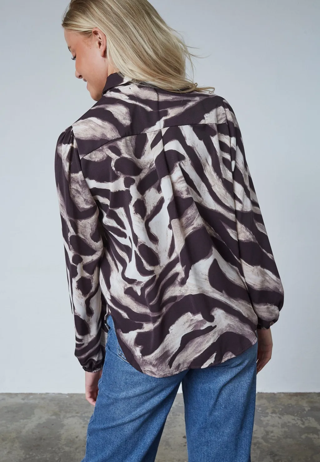 Bluse fra Sisters Point med grafisk stribemønster i brune og beige nuancer. Blusen passer til både afslappede dage og festlige lejligheder.