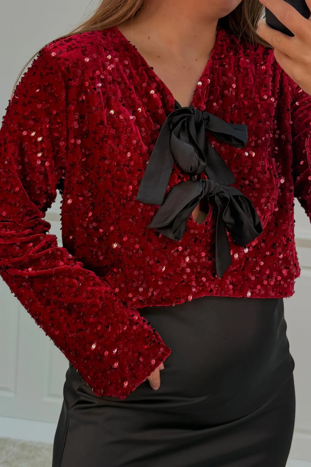 Bordeauxfarvet bluse fra A-bee med pailletter over det hele. Den har lange ærmer, V-udskæring og en sort sløjfe ved halsen. Blusen lukkes med snøre og har en almindelig pasform.