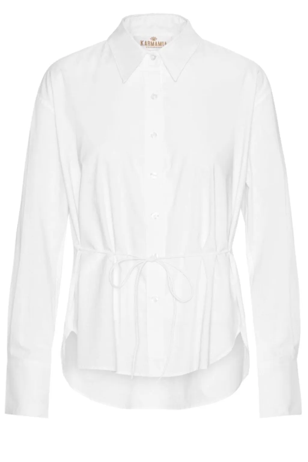 Hvid skjorte fra Karmamia med klassisk krave og knaplukning. Skjorten har en snøre i taljen og en let udvidet bund. Den passer til både jeans og nederdele.