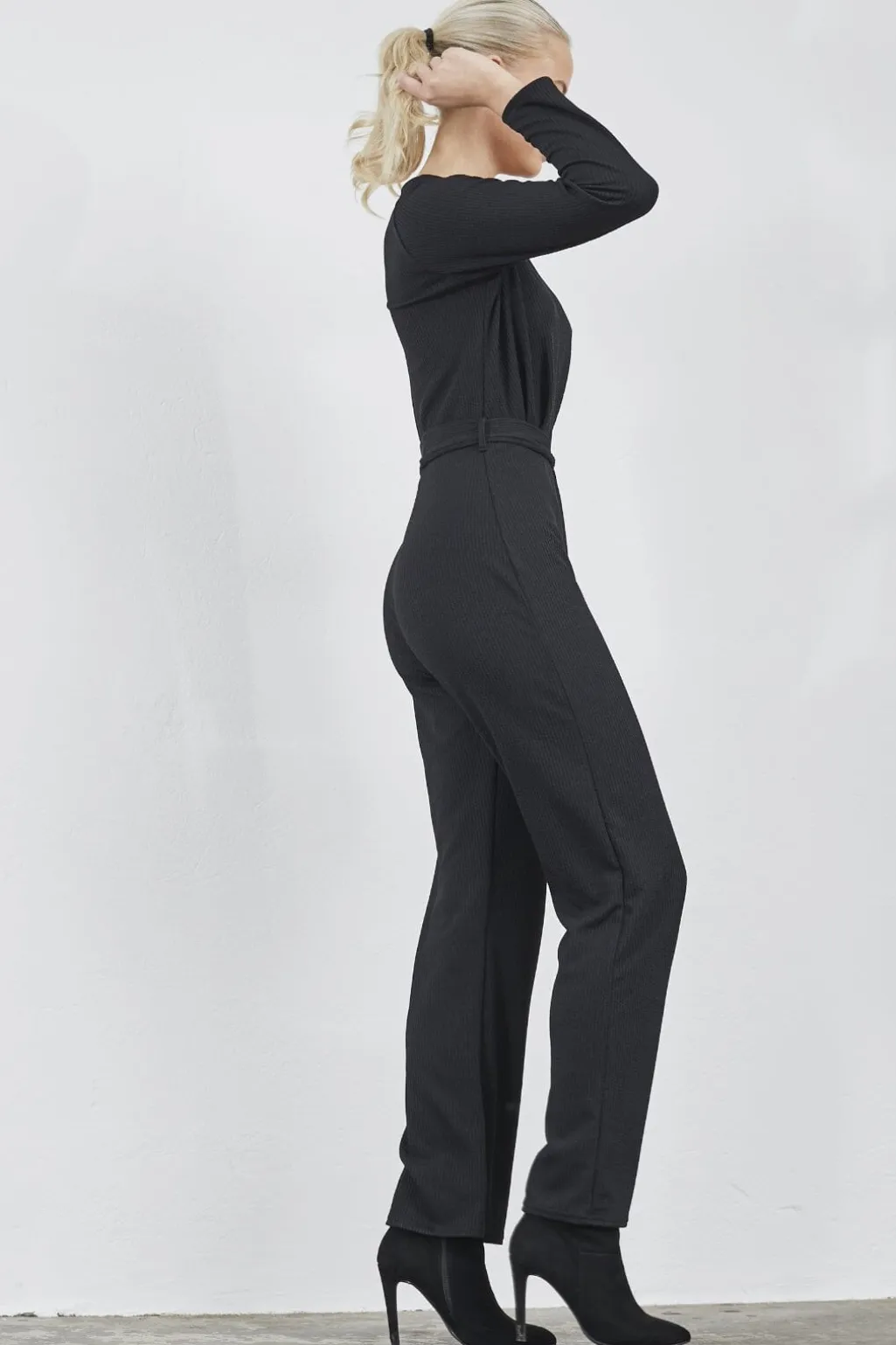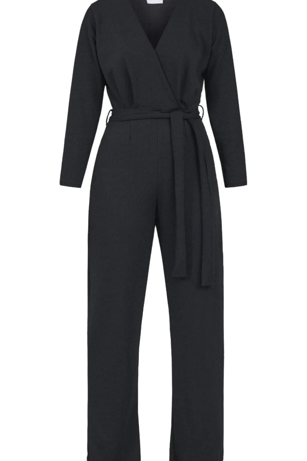Sort jumpsuit fra Sisters Point i ribstof med wrap-design. Den har lange ærmer, V-halsudskæring og et bælte i taljen til justering af pasformen.