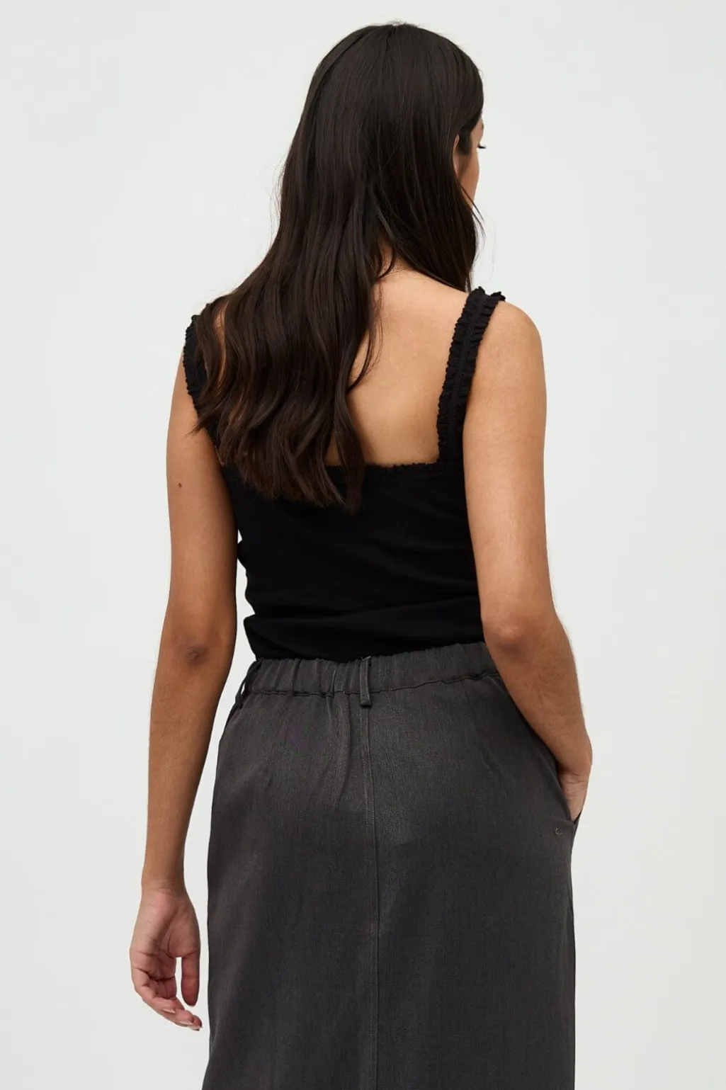 Sort tanktop fra MbyM med ribbet tekstur. Toppen har rynkede kanter ved halsudskæringen og stropper samt en tætsiddende pasform.