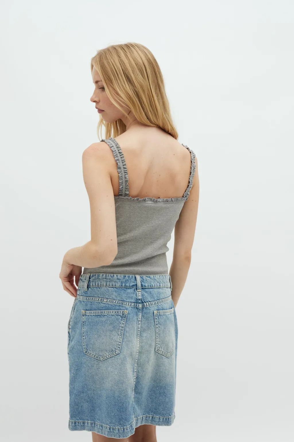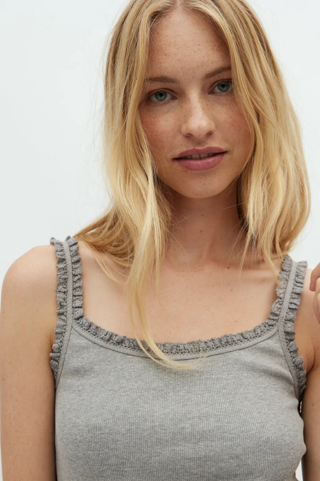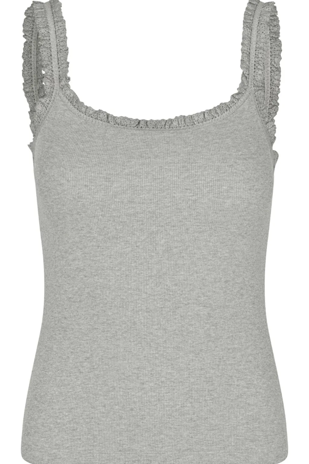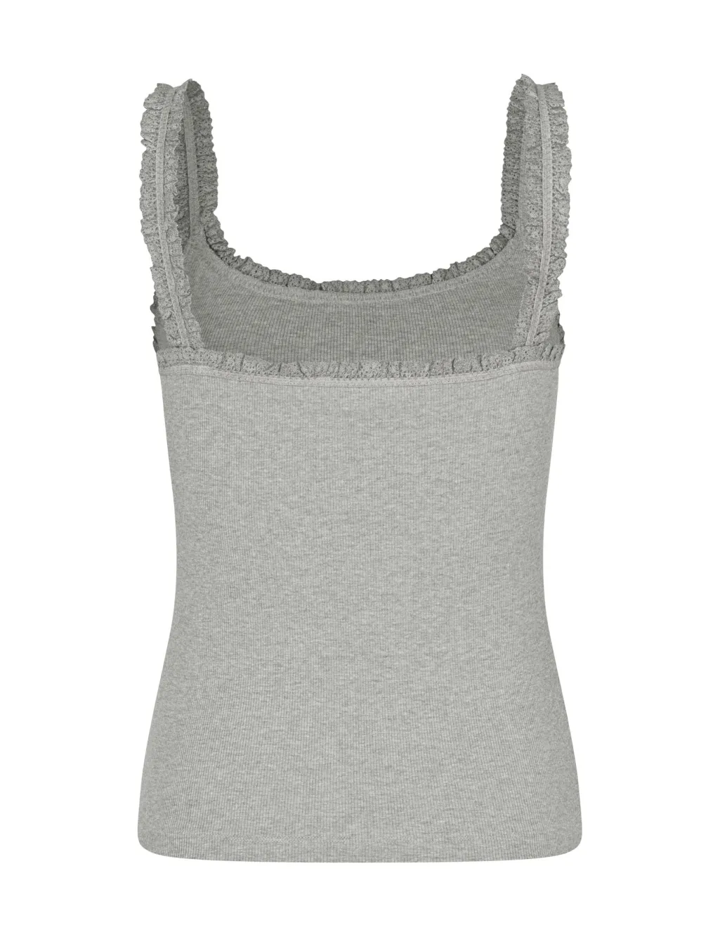 Grå tanktop fra MbyM med firkantet udskæring og flæsekanter på stropperne. Toppen er lavet i en blød, meleret kvalitet med en behagelig pasform.