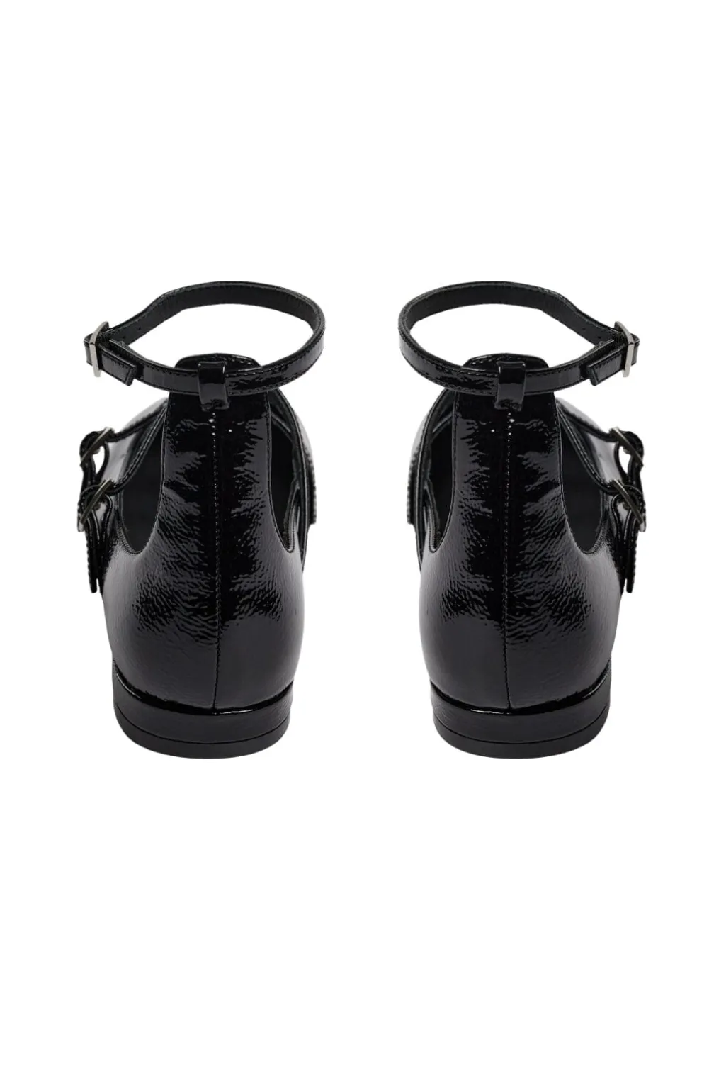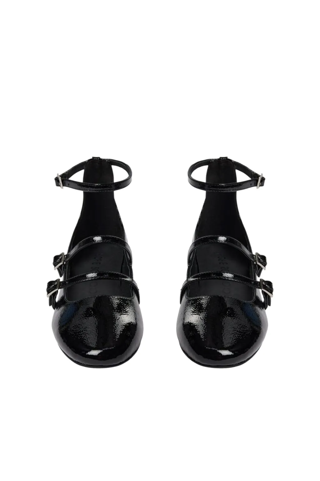 Sort ballerina fra Sofie Schnoor med skinnende lakeret overflade. Skoen har tre krydsende remme med spænder og en spids tå.
