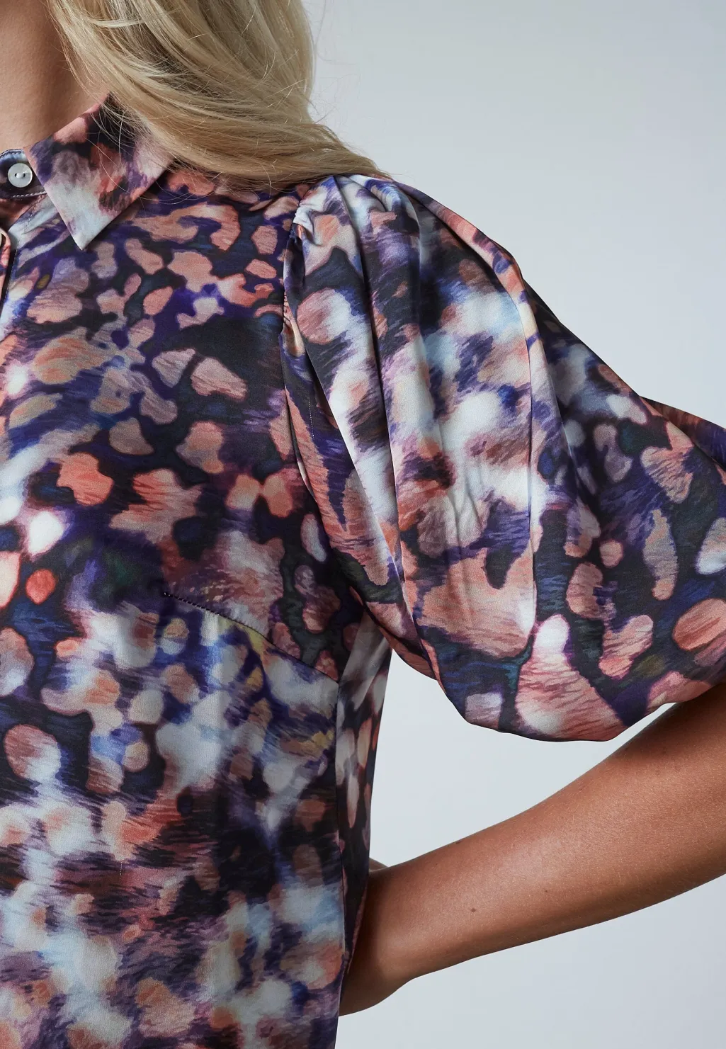 Skjorte fra Sisters Point med et farverigt, abstrakt mønster i nuancer af blå, pink og sort. Skjorten har korte puffærmer og en klassisk spids krave.