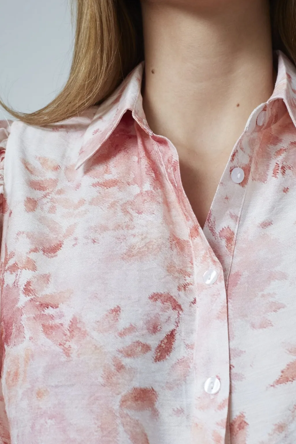 Skjorte fra Sisters Point med blomsterprint i lyserød og orange på hvid bund. Den har pufærmer i 3/4 længde, skjortekrave og knaplukning foran.