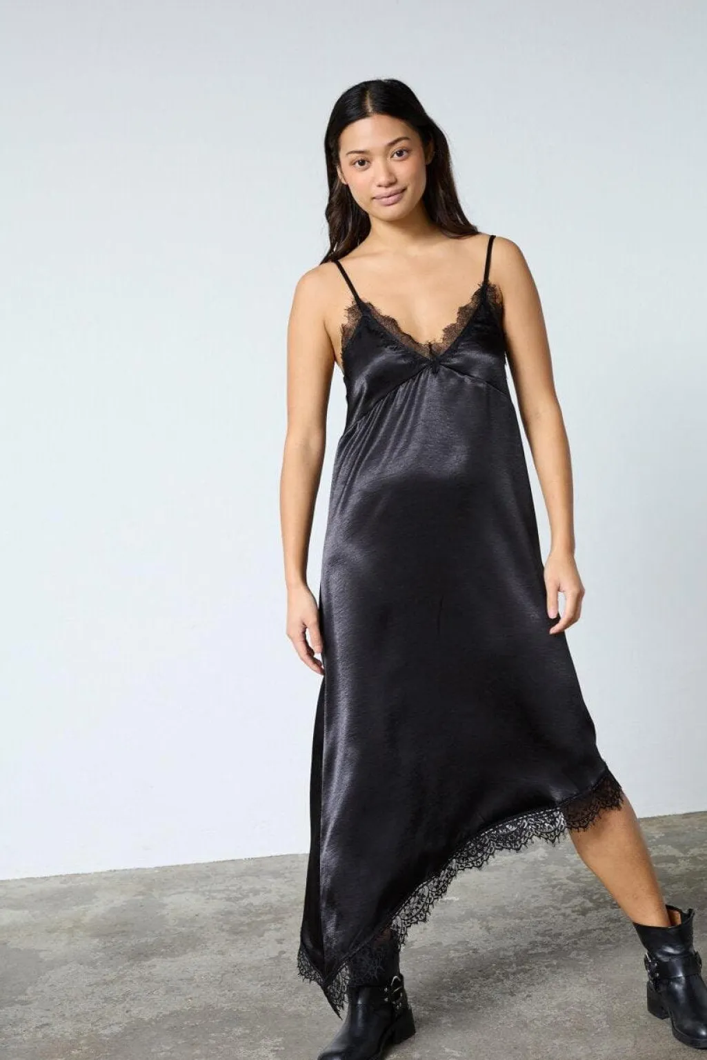 Sort kjole fra Sisters Point, lavet af skinnende satin-look materiale. Materialet er flydende og let med en glat overflade.