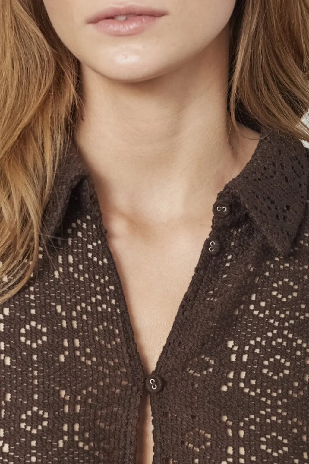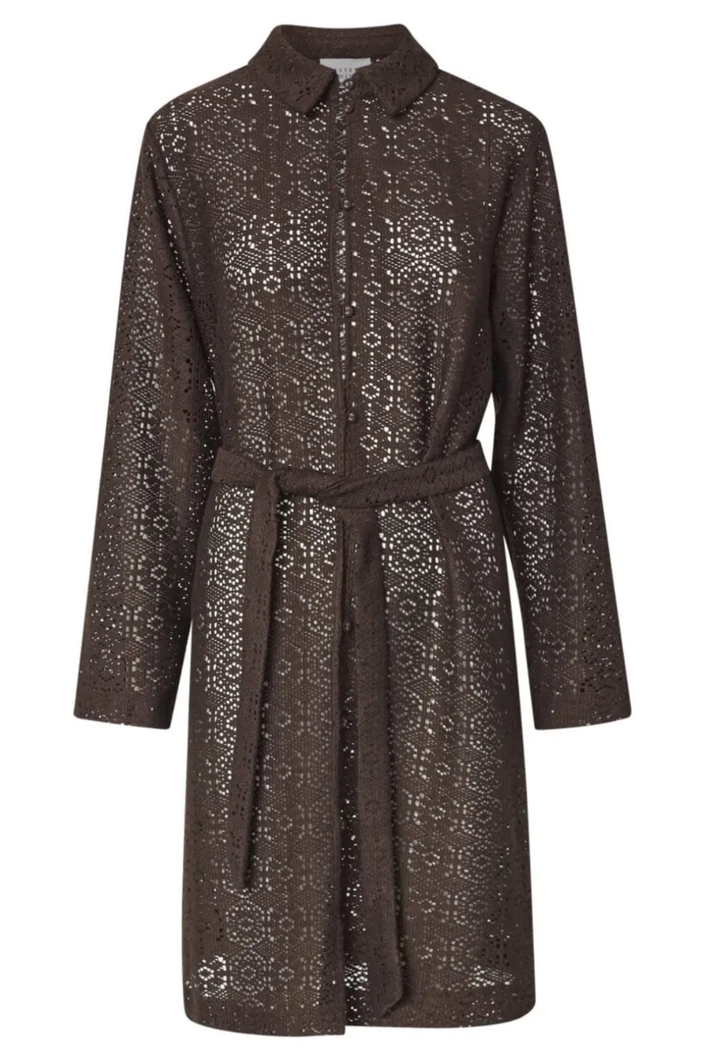 Knælang tunika fra Sisters Point i mørkebrun. Tunikaen er strikket med et hulmønster, der giver en transparent effekt gennem stoffet.