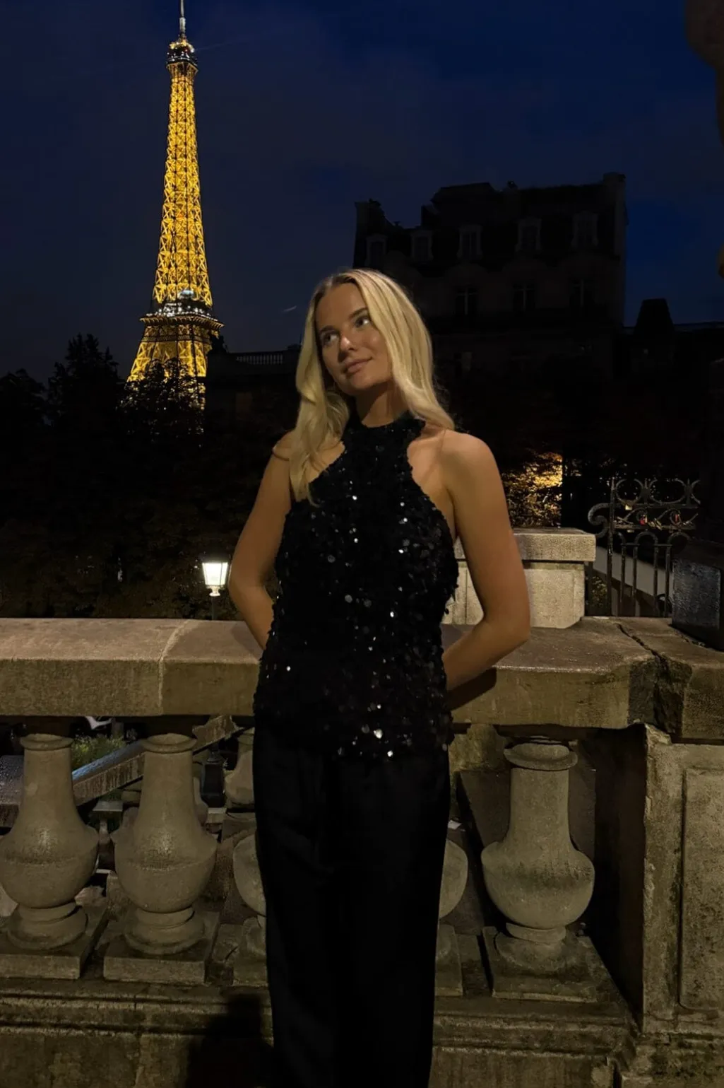 Sort paillettop fra BYIC med høj halsudskæring. Toppen har en åben ryg med knaplukning i nakken og et elastisk stof med foer.
