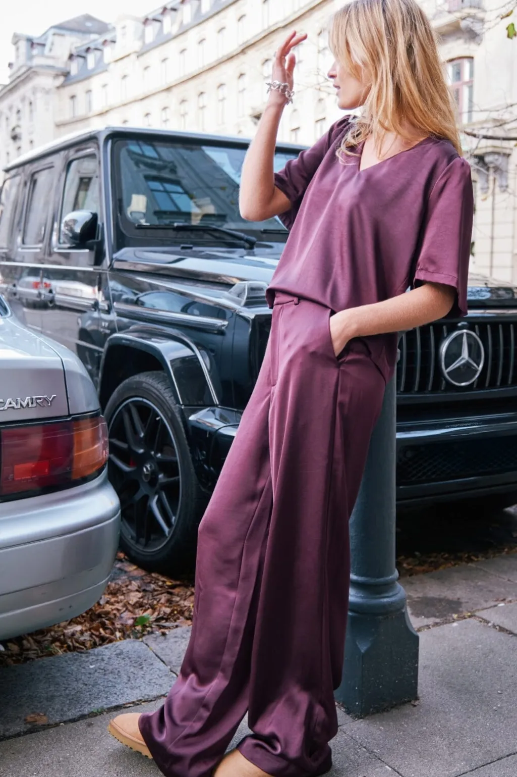 Bukser fra Neo Noir i dyb bordeauxfarve. Lavet af heavy sateen med en lige silhuet og gulvlængde. Bukserne har synlige lommer og dekorative syninger.