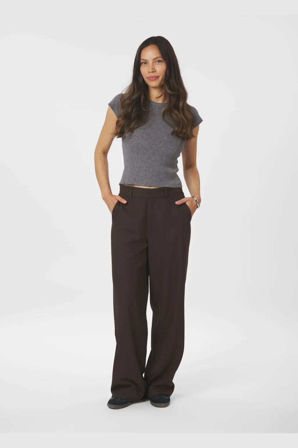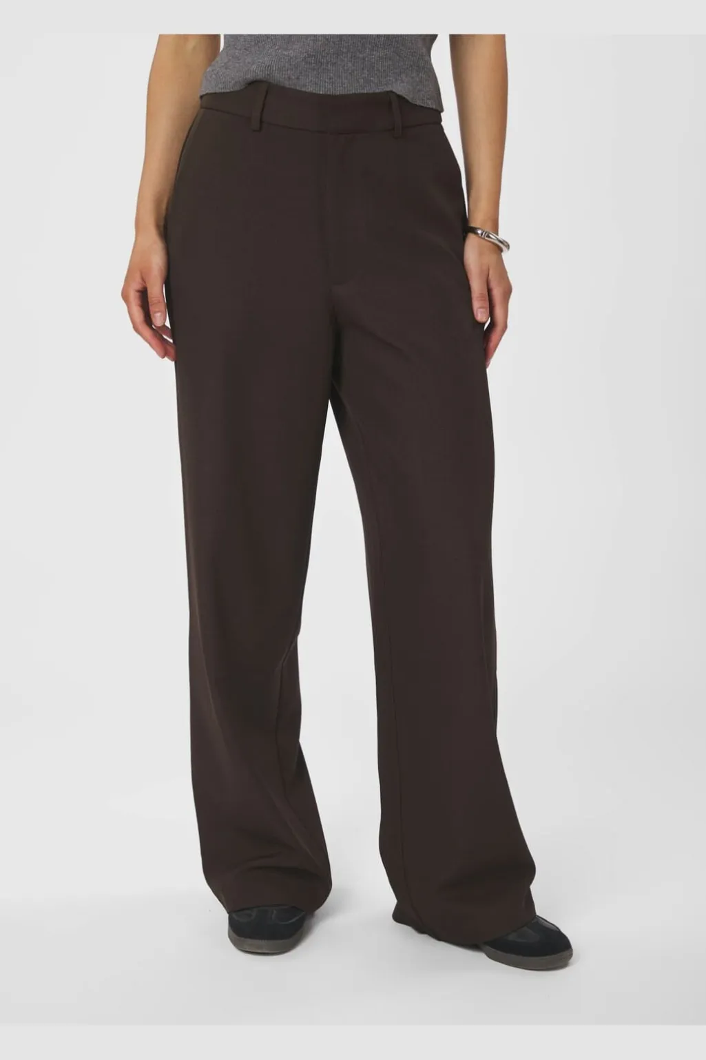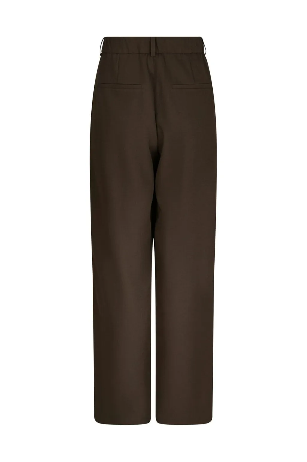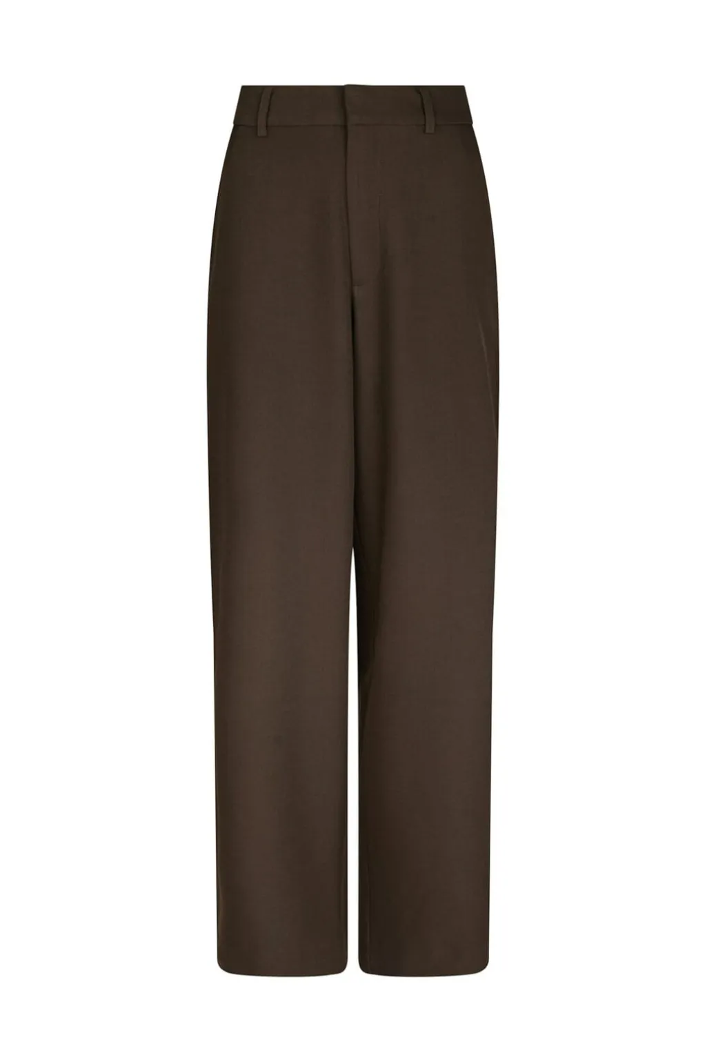 Mørkebrune bukser fra Neo Noir i tykt stof. De har en høj talje og en løs pasform med brede ben, der går helt ned til gulvet. Bukserne kan bruges til både hverdag og fest.
