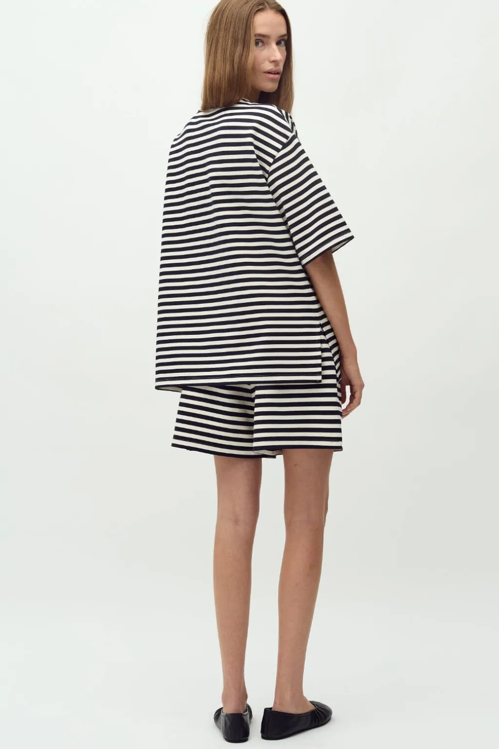 Stribet t-shirt fra MbyM med vandrette striber i marineblå og cremehvid. Den har en rund halsudskæring og brede ærmer med en afslappet pasform.