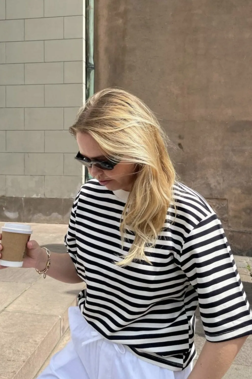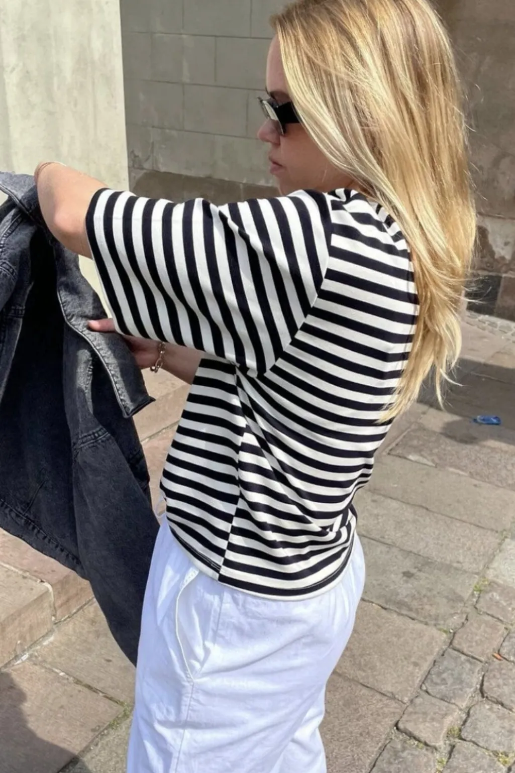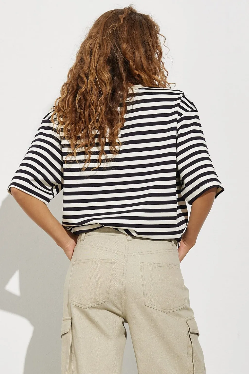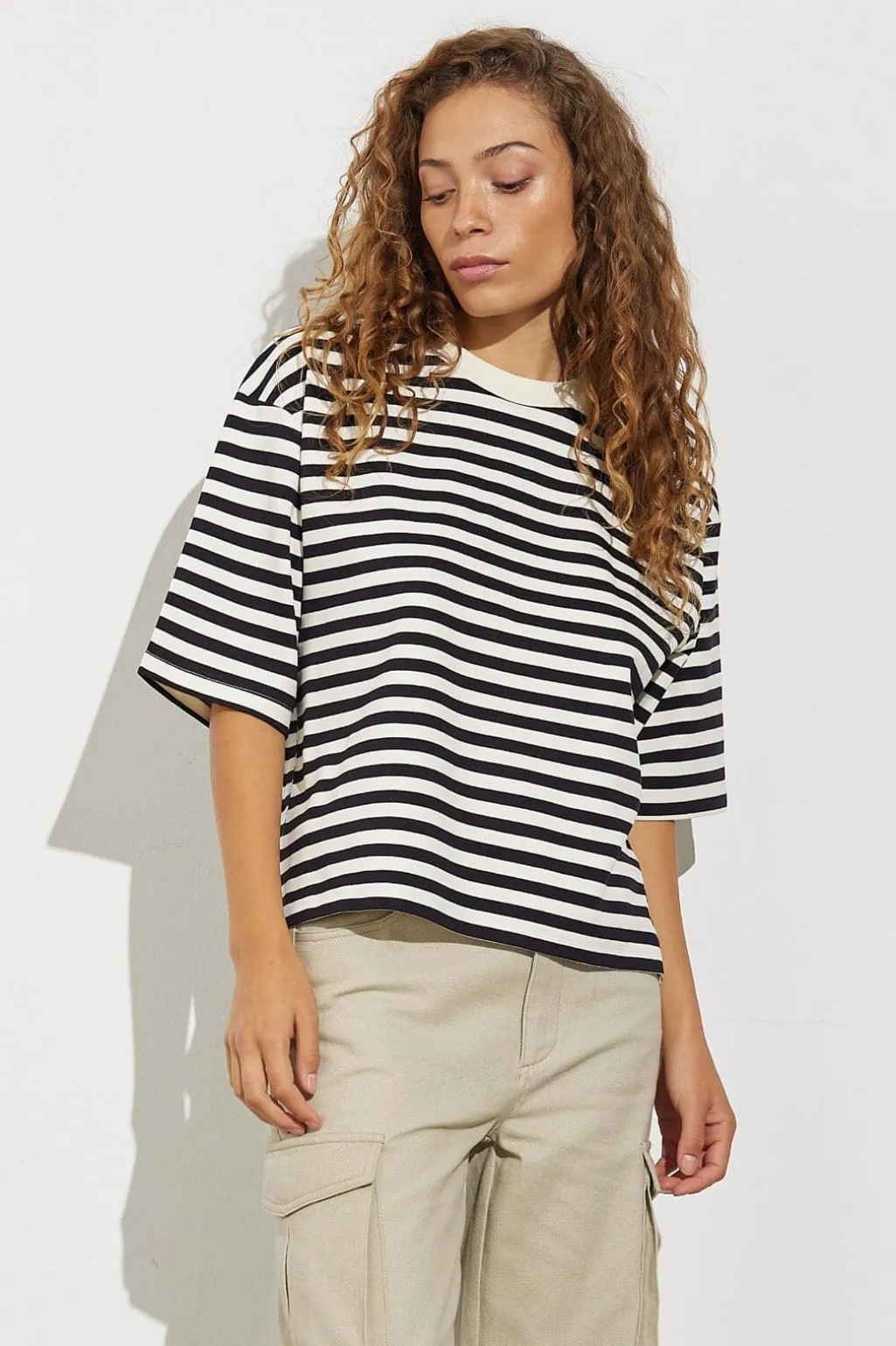 Stribet t-shirt fra MbyM med brede striber i navy og hvid. T-shirten har en løs pasform og korte ærmer med rund halsudskæring.