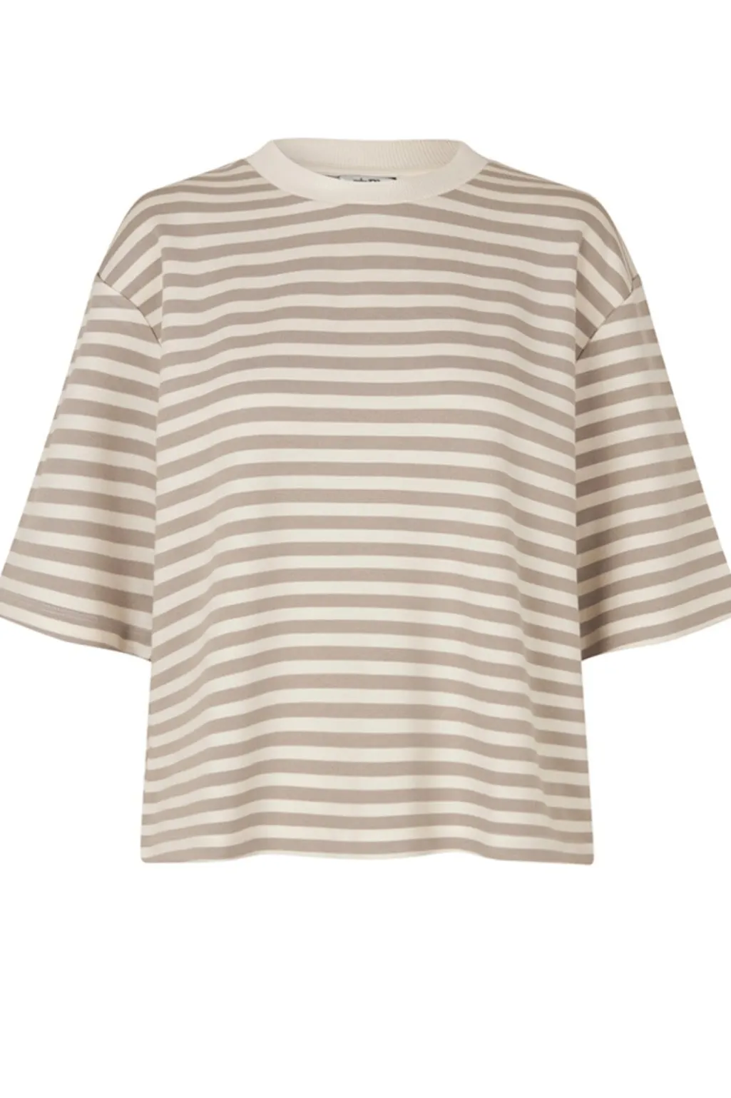 Stribet t-shirt fra MbyM med rund hals og korte ærmer. Den oversized t-shirt har et mønster i beige og cremefarvede striber på en lys baggrund.