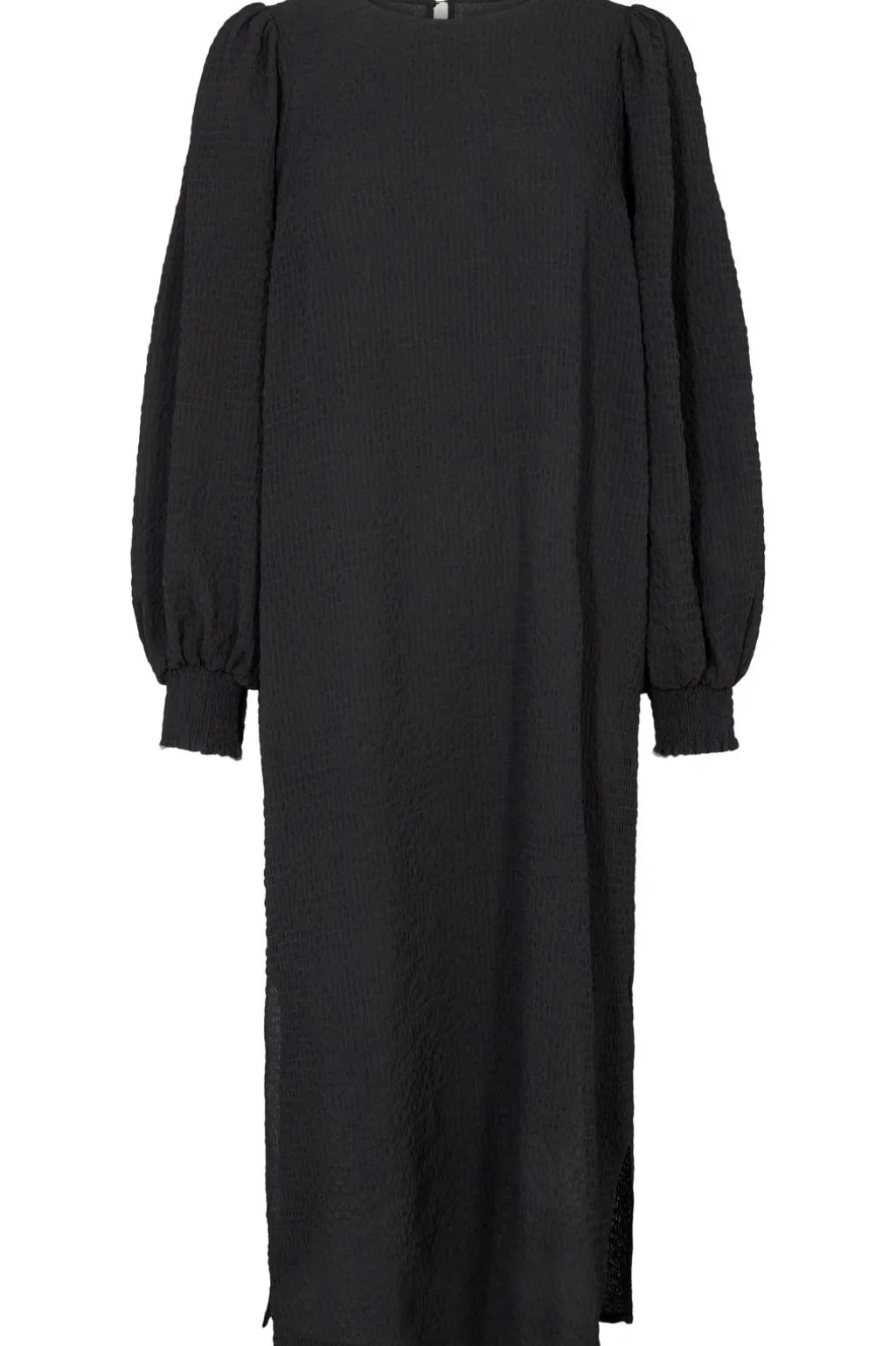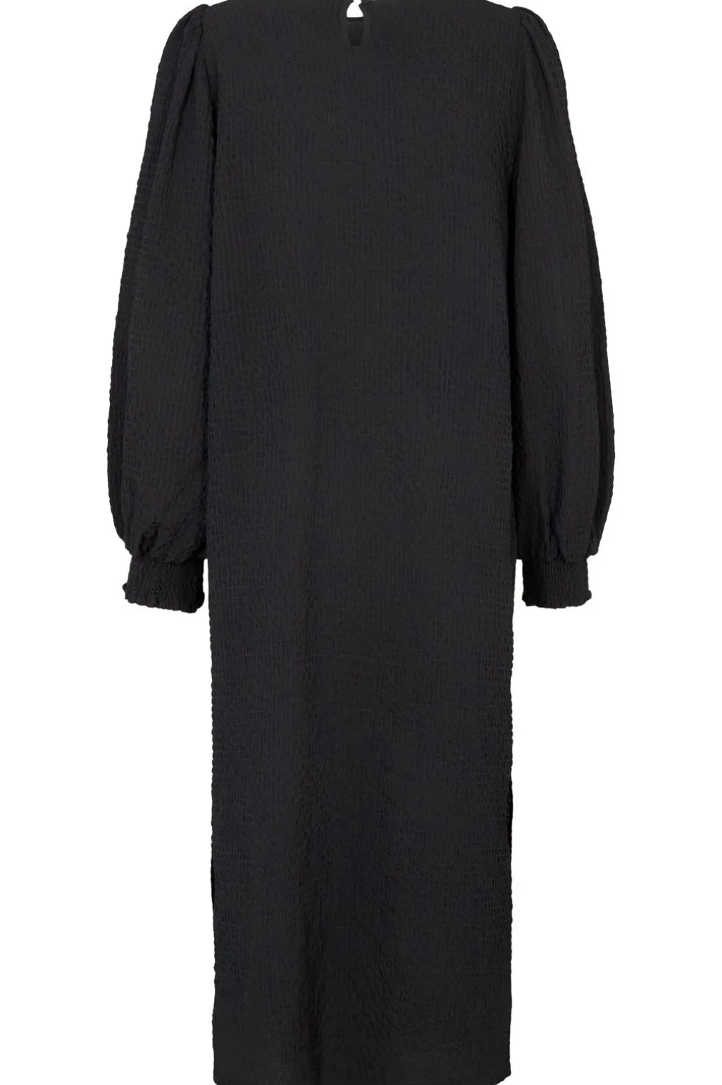 Sort kjole fra Liberte med struktureret materiale og lange ballonærmer. Kjolen har rund hals og går til læggen med slids i siderne.