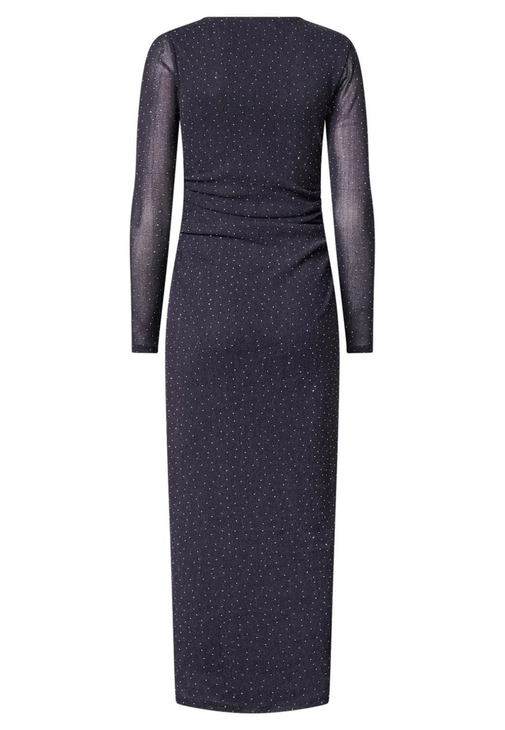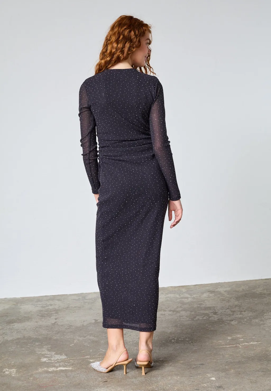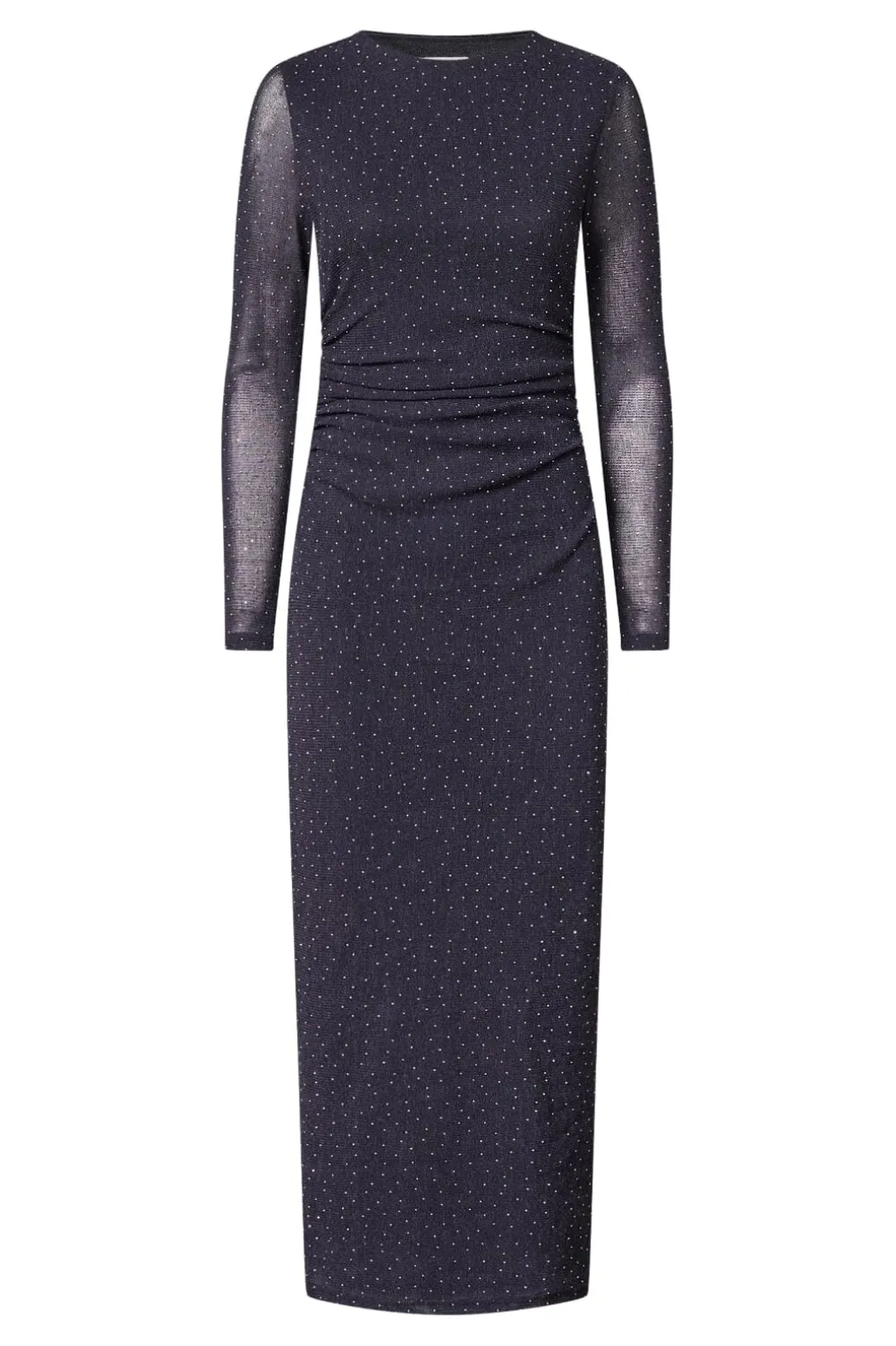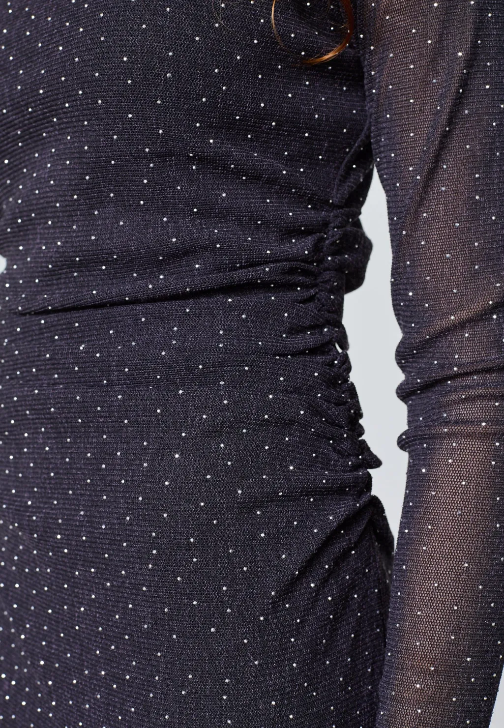Sort kjole fra Sisters Point med sølvfarvede prikker. Den har lange ærmer og rund halsudskæring. Kjolen går til midt på læggen og har rynkedetaljer i siderne.
